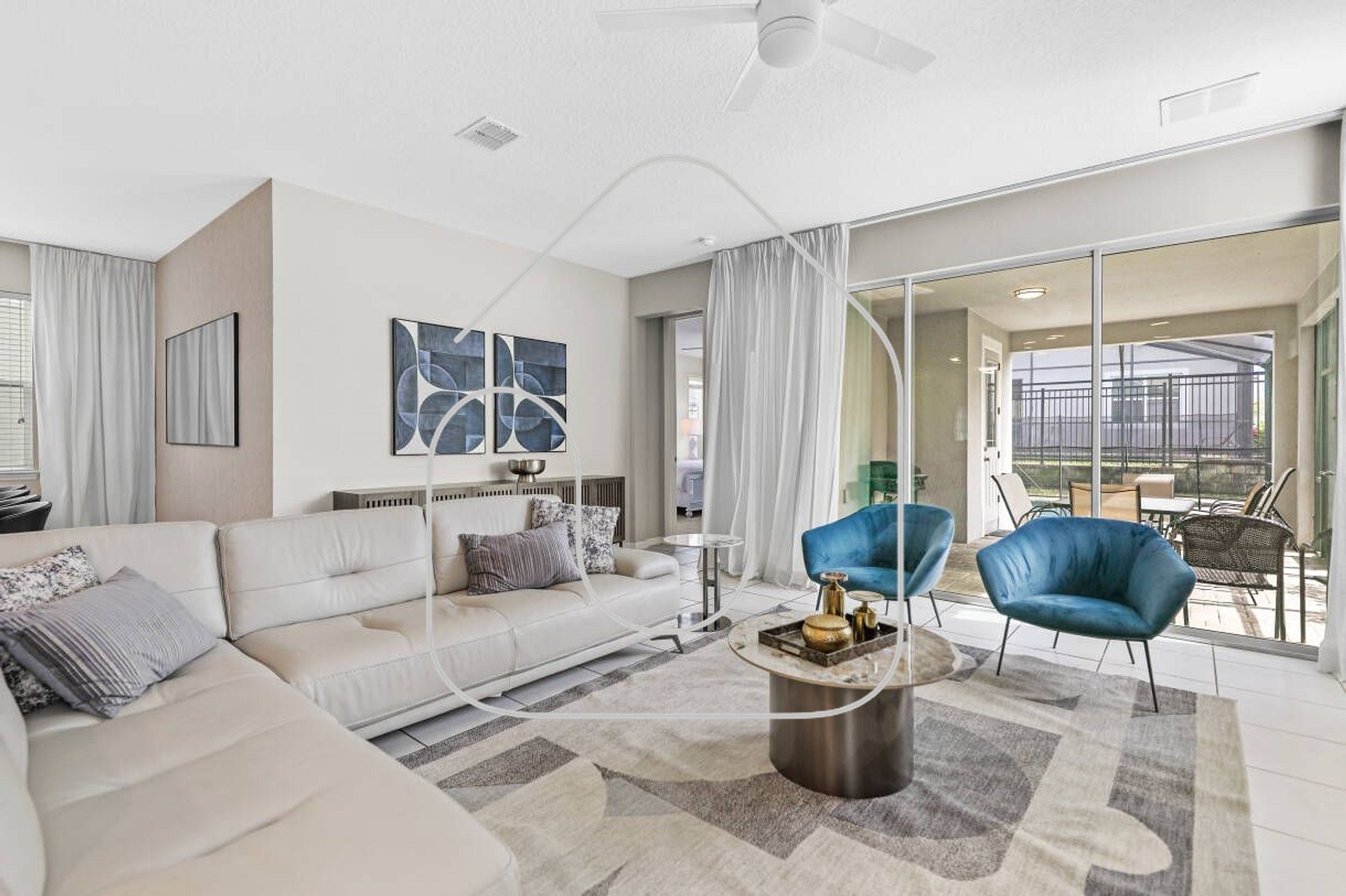 O primeiro andar conta com um ambiente integrado e moderno, com cozinha totalmente equipada, mesa de jantar ampla e sala de estar aconchegante com Smart TV — perfeita para relaxar após um dia nos parques. As portas de vidro deslizantes dão acesso à área externa com piscina privativa, ideal para tomar sol ou dar um mergulho refrescante.