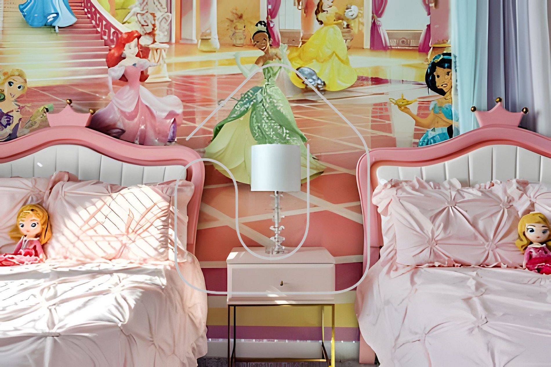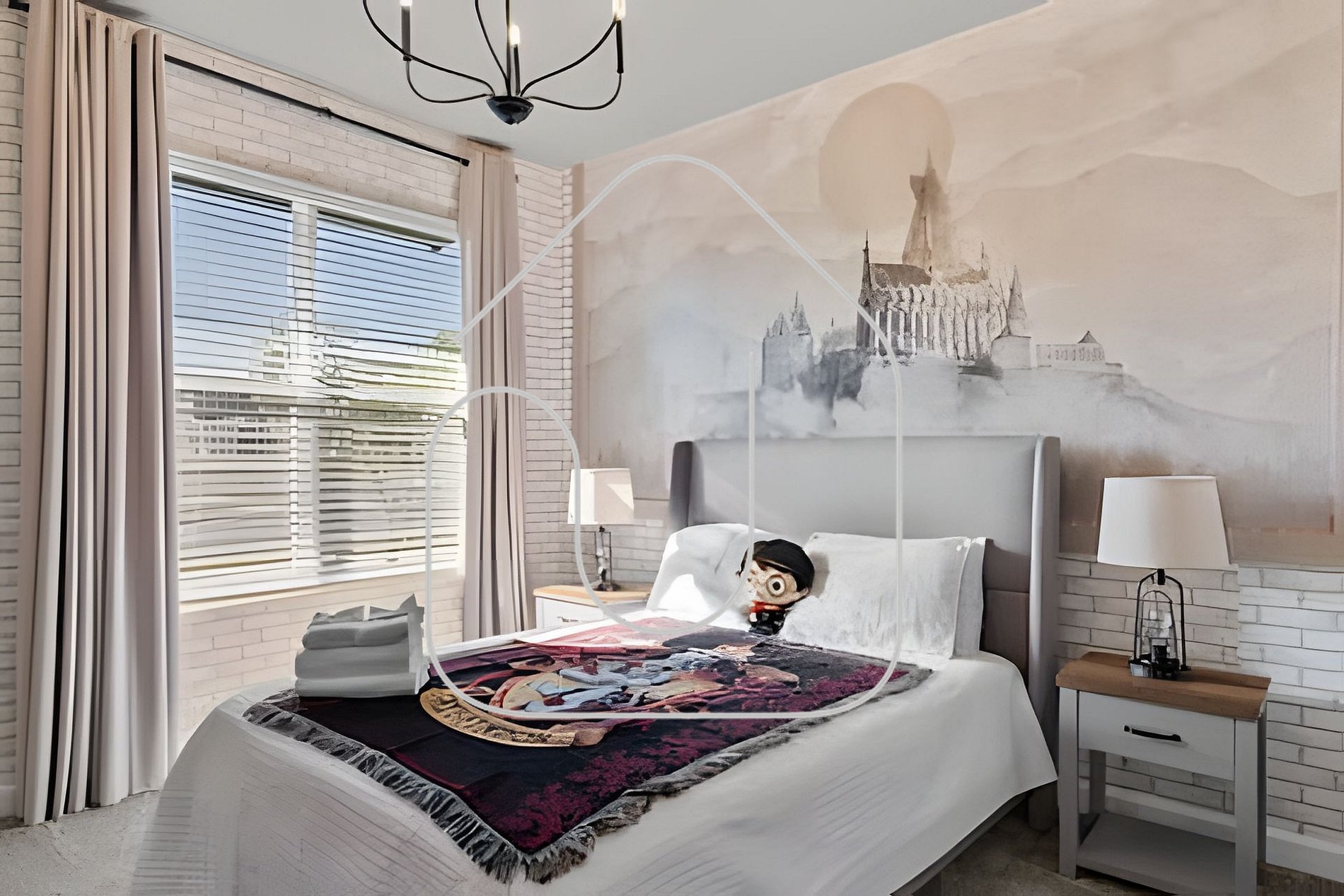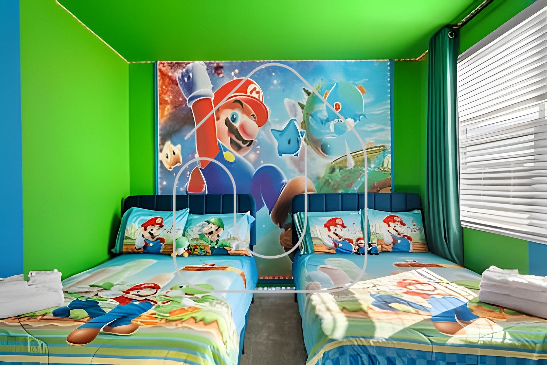 Casa 5Q/5B no Champions Gate com quartos temáticos de Harry Potter, Princesas e Mario Bros, piscina privativa aquecida e sala de jogos do Spider-Man! Acomoda até 14 pessoas. Acesso completo ao resort, design moderno e suporte 24h.