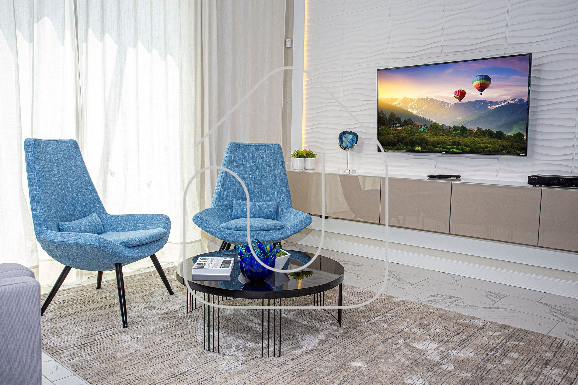 Sala espaçosa: Com um sofá confortável e TV de alta definição. A área se abre para a piscina privativa. Sala de jantar: Mesa para 6 pessoas e bancada de café da manhã.