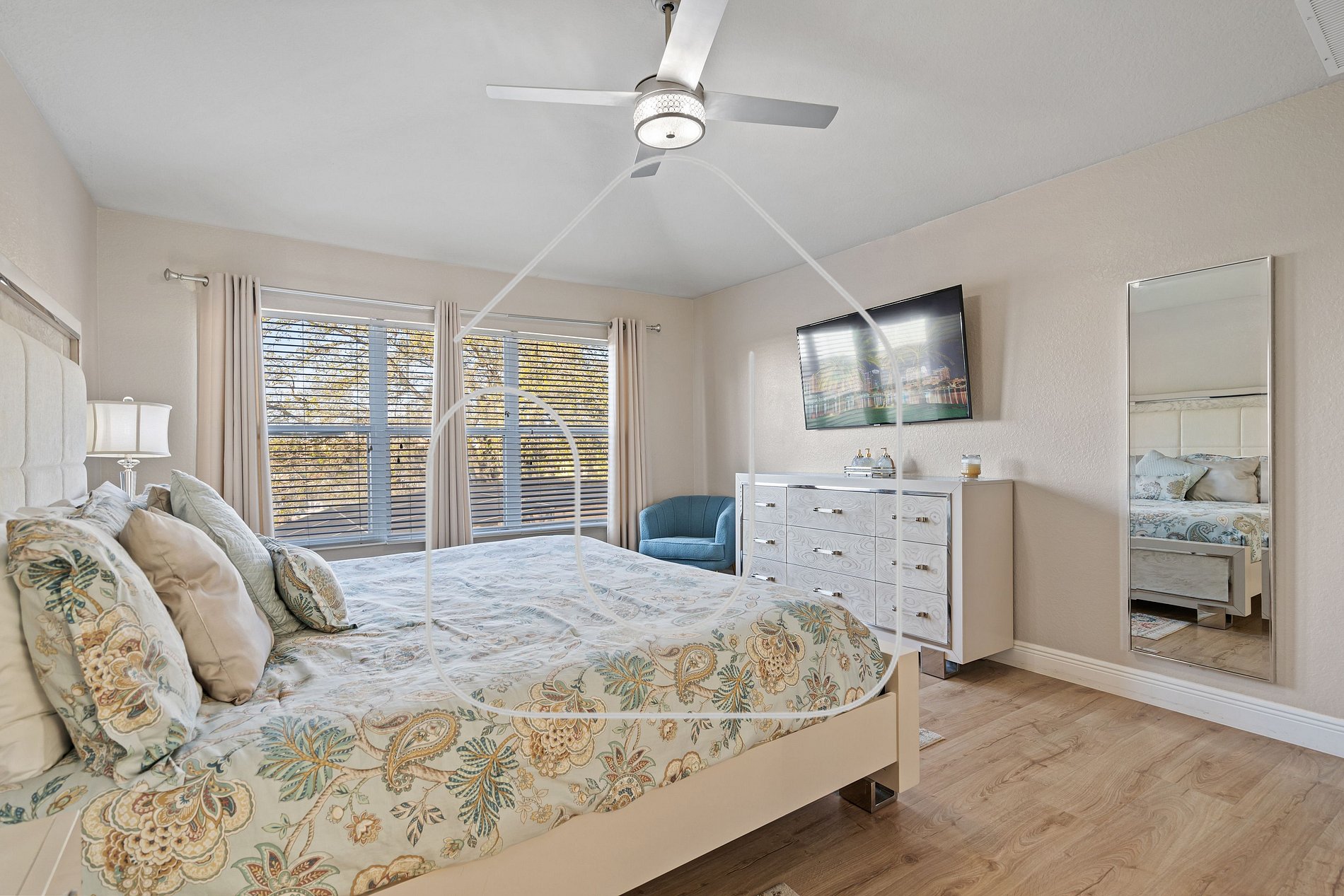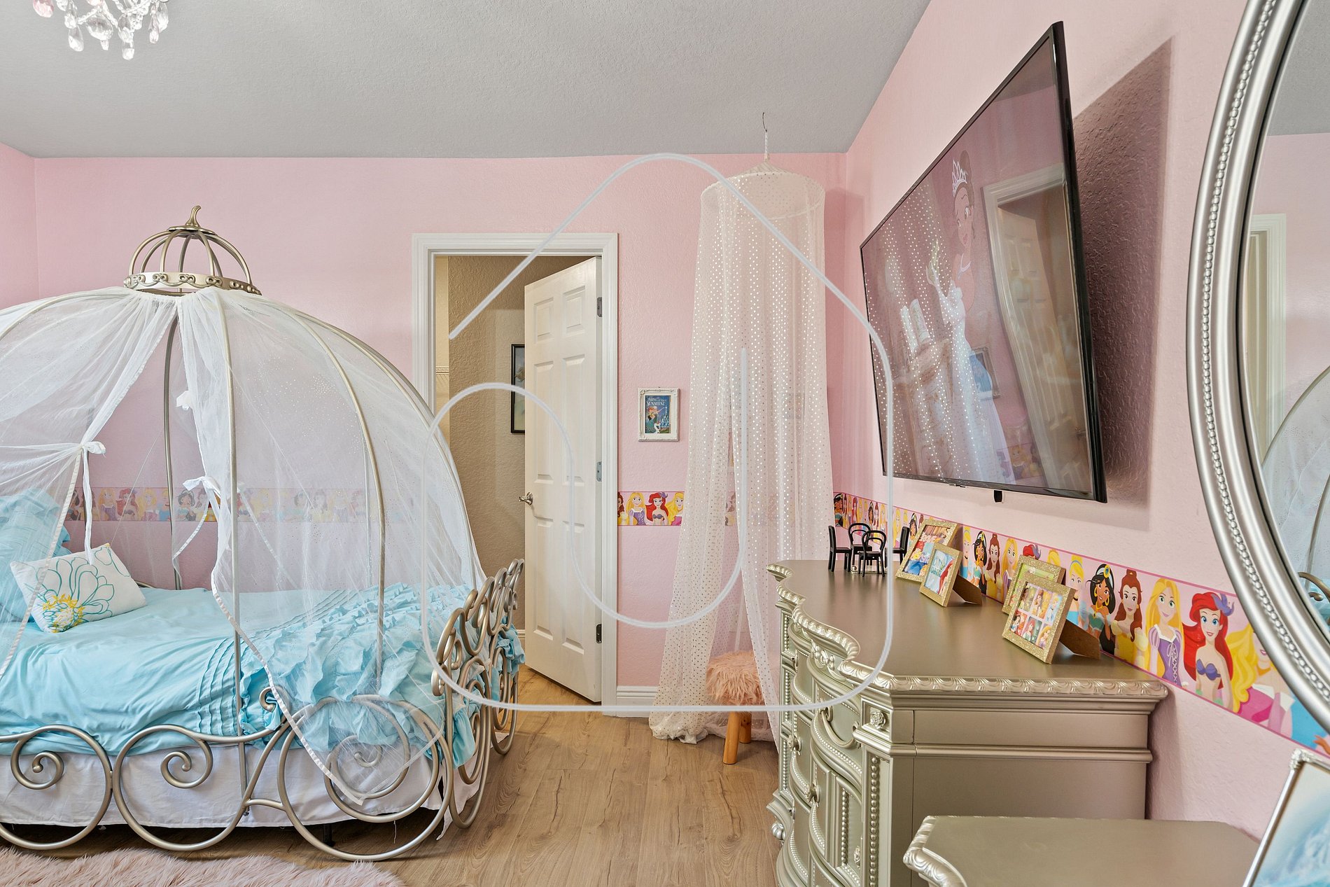 São três quartos com camas king lindamente decorados e três quartos temáticos para as crianças. Os pequenos vão adorar os quartos temáticos de *Princesas, **Mickey Mouse, e *Star Wars, garantindo uma experiência mágica. Um quarto com cama king está convenientemente localizado no térreo com banheiro compartilhado, enquanto os outros cinco estão no andar de cima, incluindo duas suítes master com banheiros privativos.