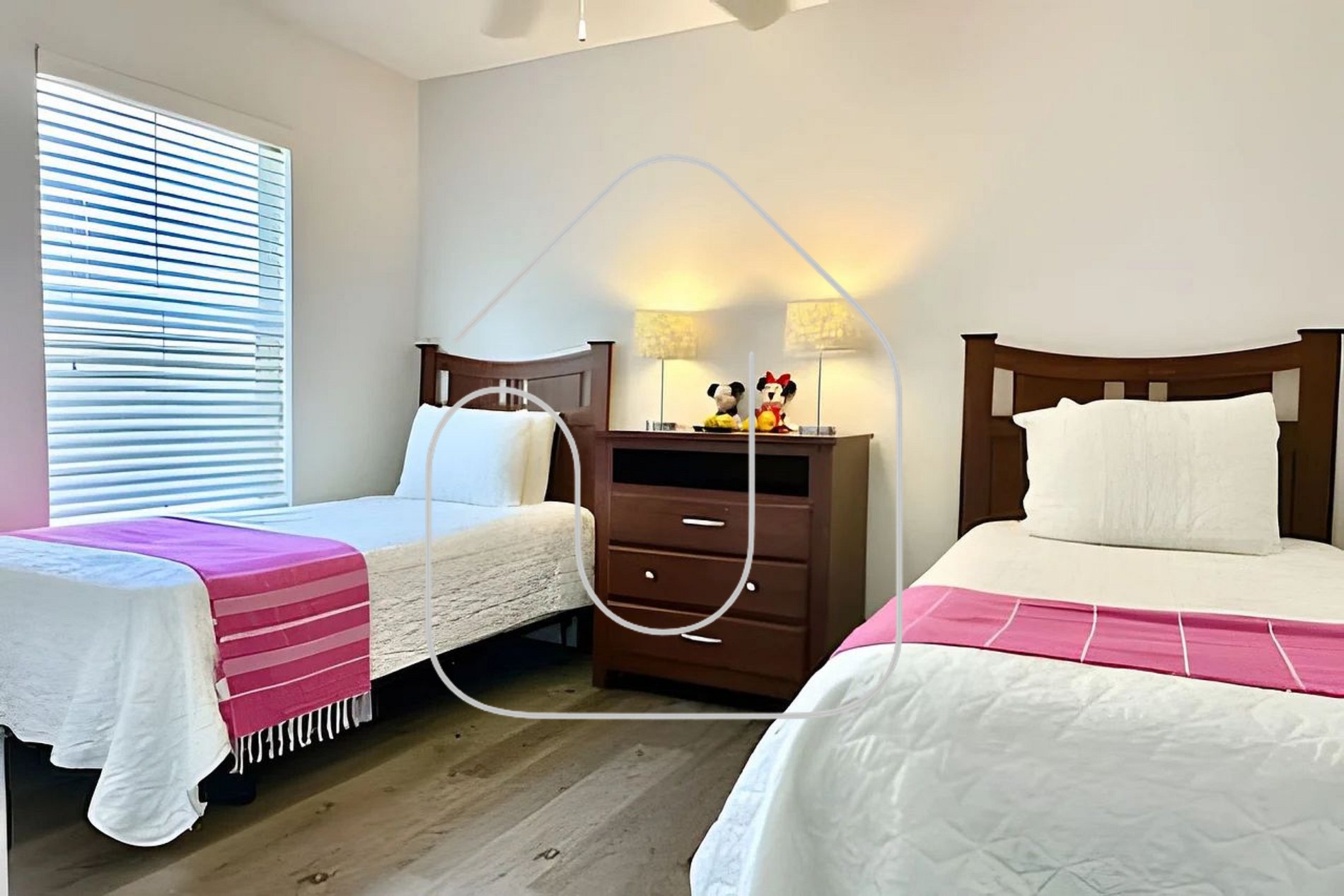 Quarto 3 (Piso Superior): 2 camas de solteiro, TV Roku, ventilador de teto (acomoda 2)
