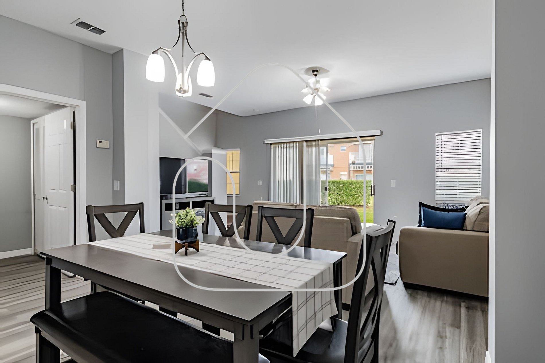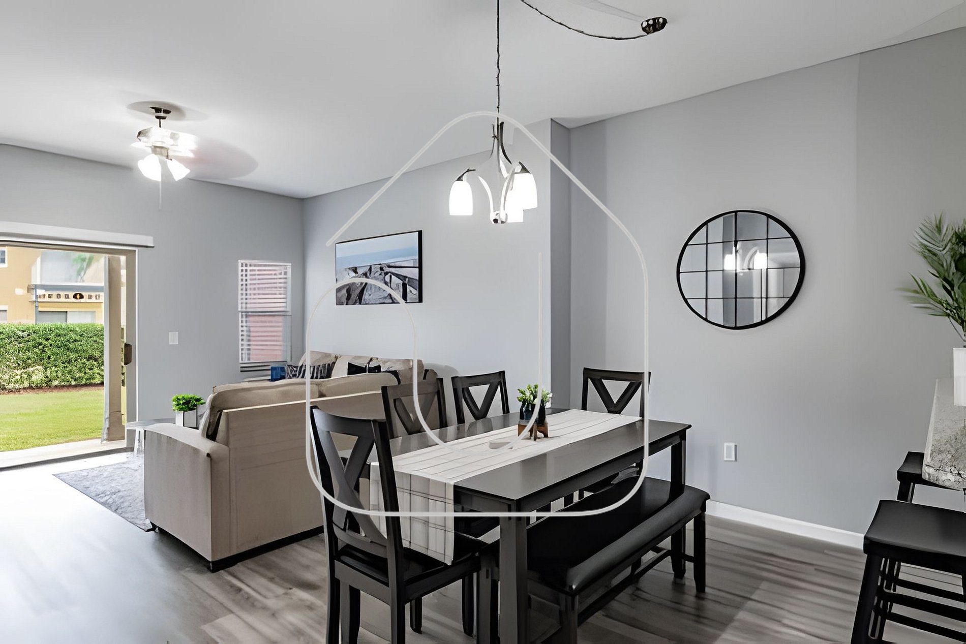 2 sofás aconchegantes e TV Roku 50”, mesa de jantar para 6 pessoas e balcão para mais 4. A cozinha está completamente equipada com aparelhos modernos, perfeita para cozinhar em casa. Wi‑Fi ilimitado, lavanderia com lava e seca e varanda particular com vista para a área de churrasco e piscina.