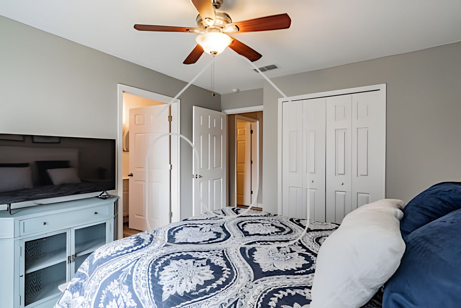 -A suíte principal tem cama queen, varanda e TV Roku 42”.