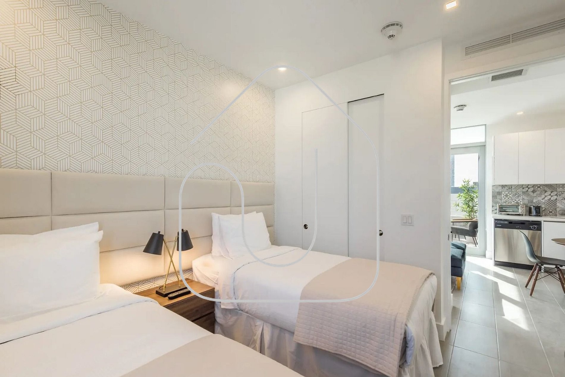 Ambiente claro e integrado que une funcionalidade e sofisticação. A sala conta com sofá-cama e smart TV, e a varanda é perfeita para relaxar e sentir o clima vibrante de Miami. A cozinha está equipada com tudo que você precisa para preparar refeições ou cafés rápidos antes de explorar a cidade.