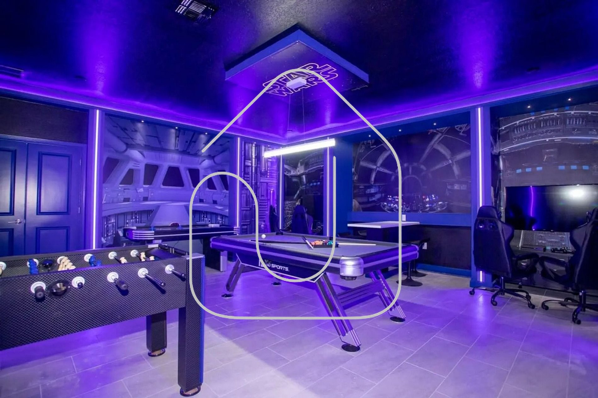 Viva o luxo nesta casa de 6 quartos e 6 banheiros no Storey Lake Resort, a apenas 10 minutos da Disney. Curta quartos temáticos como Frozen e Toy Story, sala de jogos inspirada em Star Wars e cinema com tema do Mickey. Relaxe na piscina privativa aquecida ou aproveite as comodidades do resort, como piscina pirata, lazy river, academia e mini-golfe. Wi-Fi, estacionamento e muito mais incluídos. Ideal para famílias que buscam conforto, diversão e estilo em Orlando!