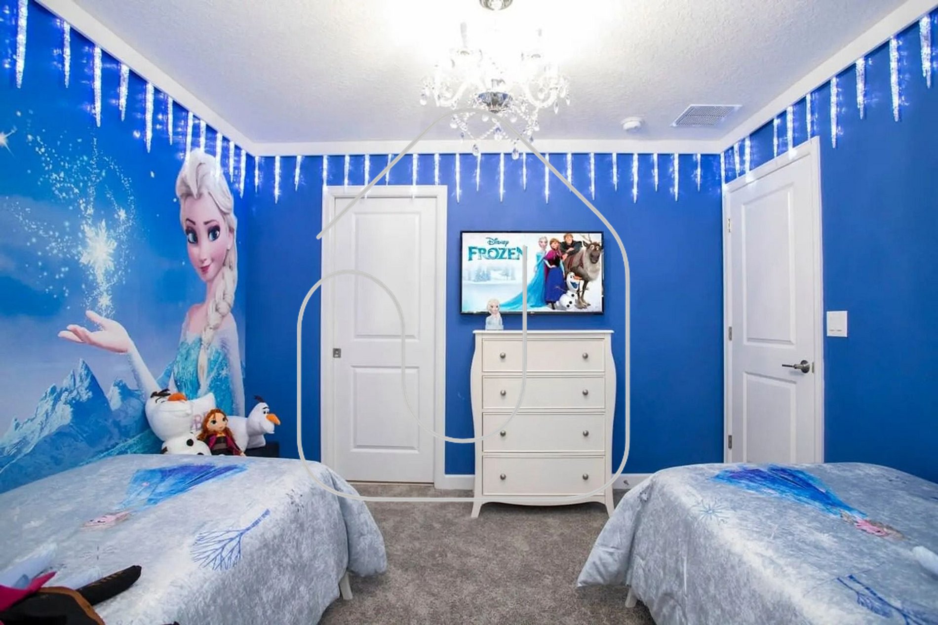 Quarto Frozen – 2 camas de solteiro em um ambiente inspirado no reino gelado.