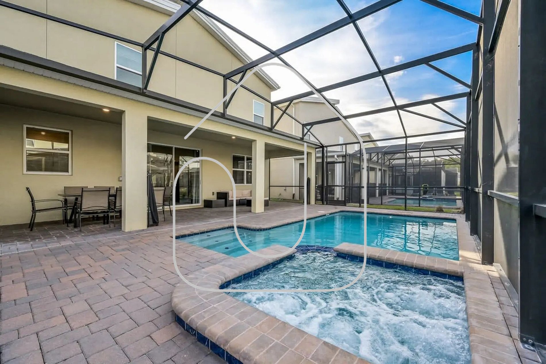 Aproveite a piscina privativa aquecível e o pátio coberto com móveis confortáveis, ideal para relaxar sob o sol da Flórida ou descansar após um dia nos parques.