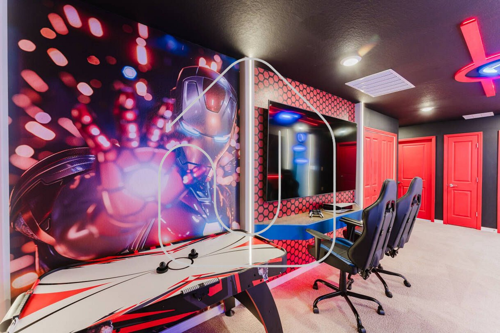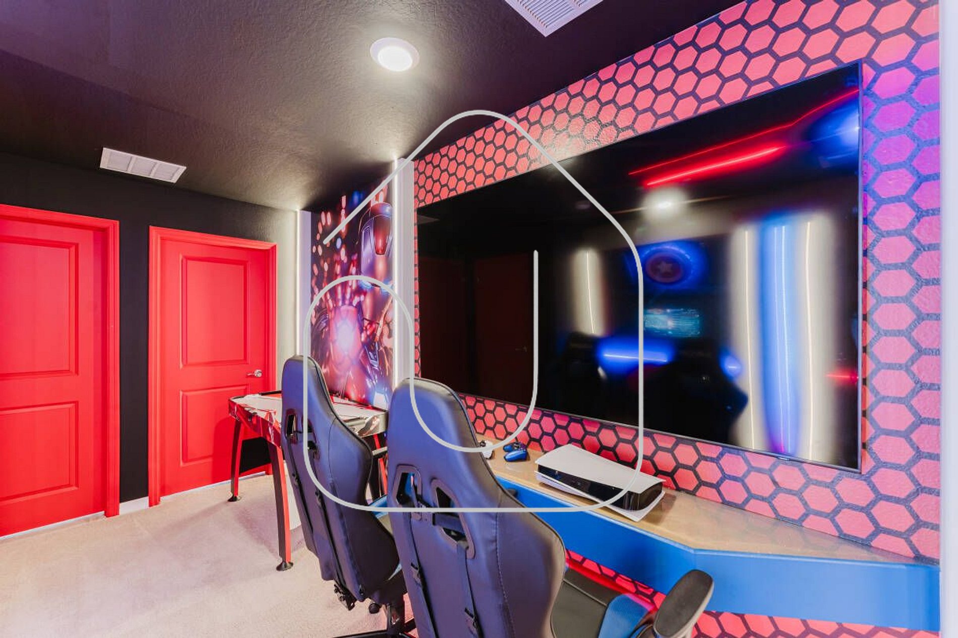 Casa moderna com 5 quartos, 4,5 banheiros e 2.265 sq ft, localizada no Windsor Island Resort, a poucos minutos da Disney. Sala ampla com TV, mesa p/ 8 e balcão p/ 4, cozinha completa. No andar superior: loft com TV smart e PS5. Quartos: 2 king, 1 queen, beliches temáticos (Princesas e Toy Story). Wi‑Fi grátis, TV a cabo, lavanderia, ar-condicionado central. Piscina privativa aquecível e churrasqueira como extras.