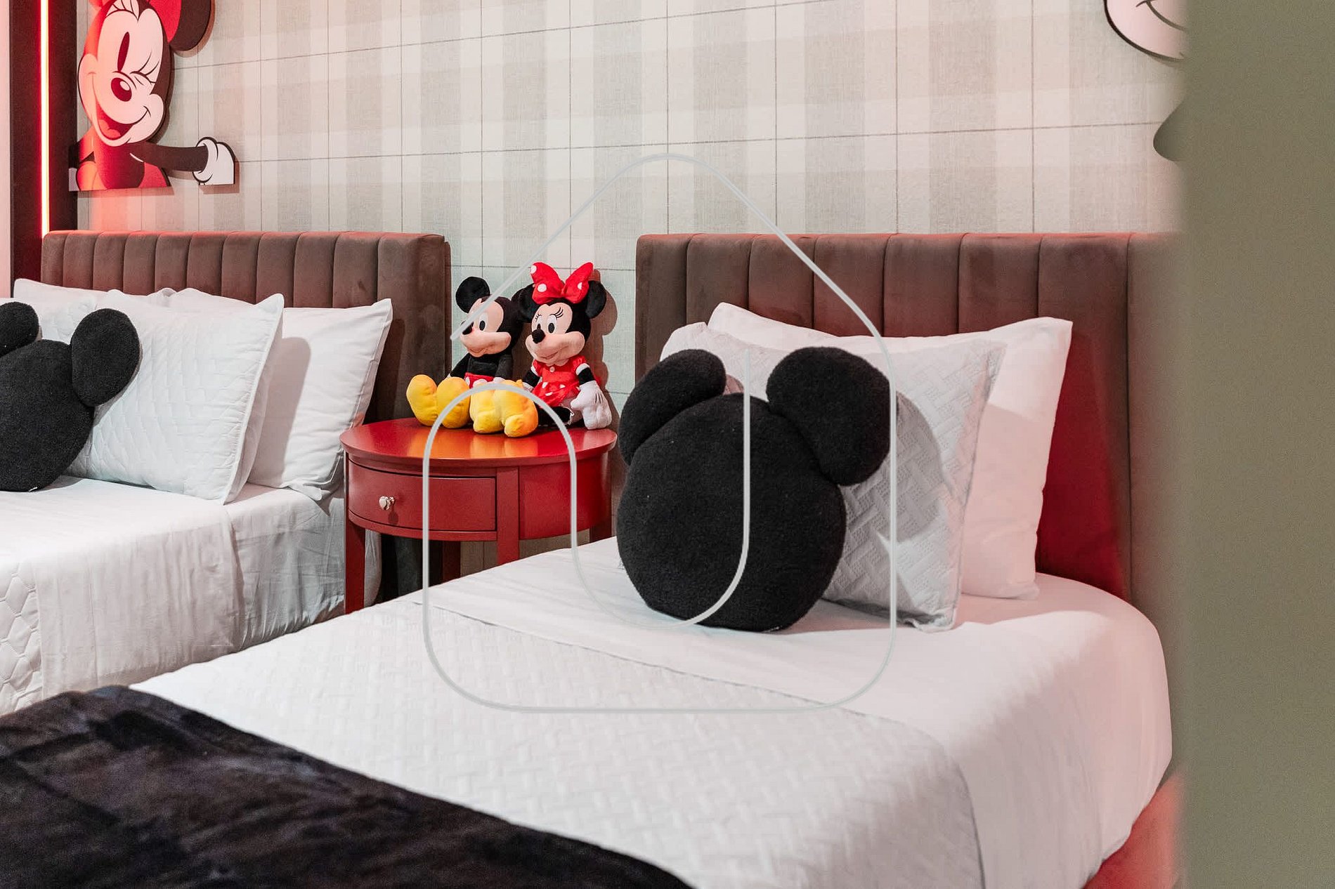 Quarto Mickey com cama de casal e cama de solteiro e banheiro privativo