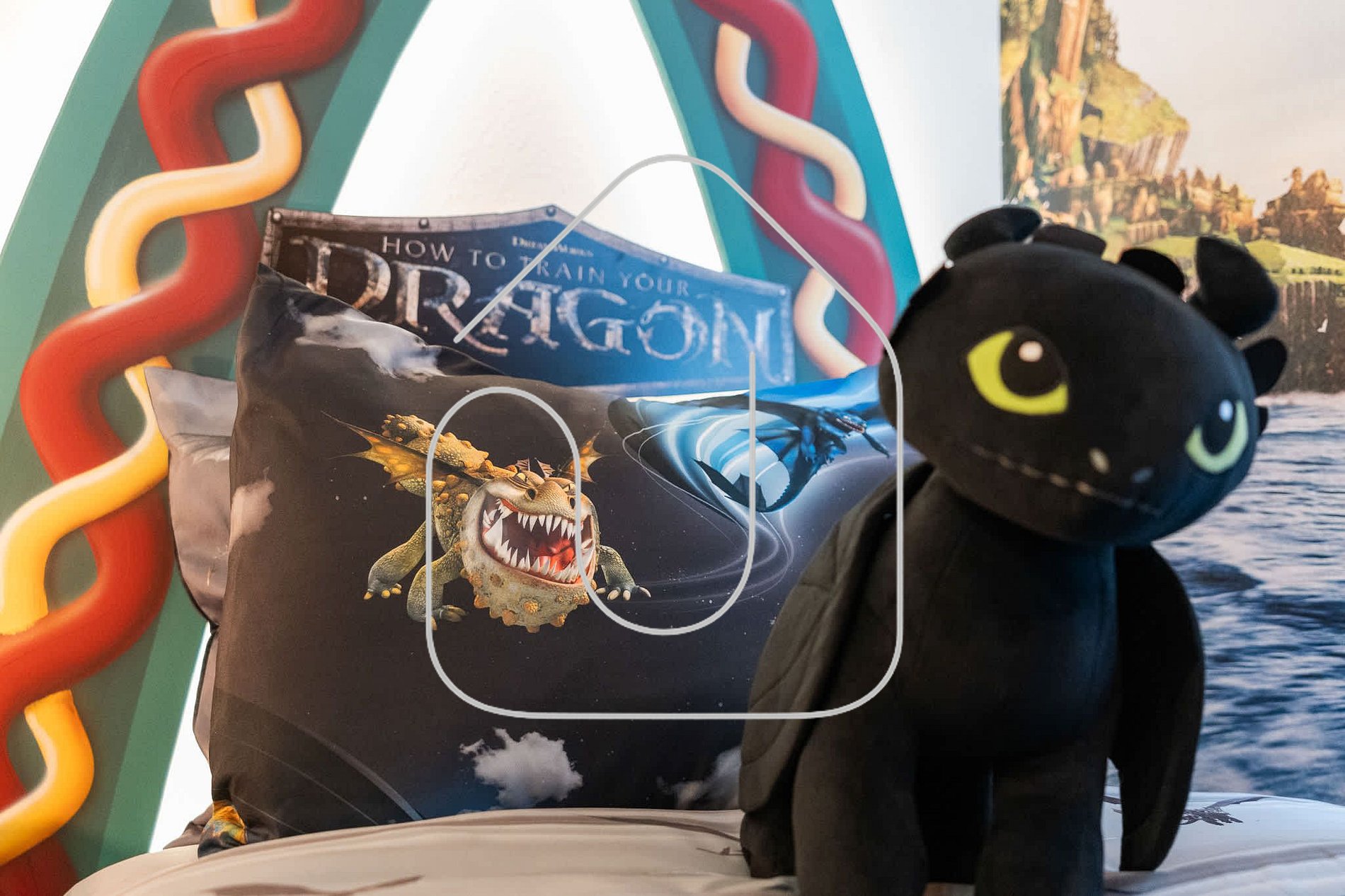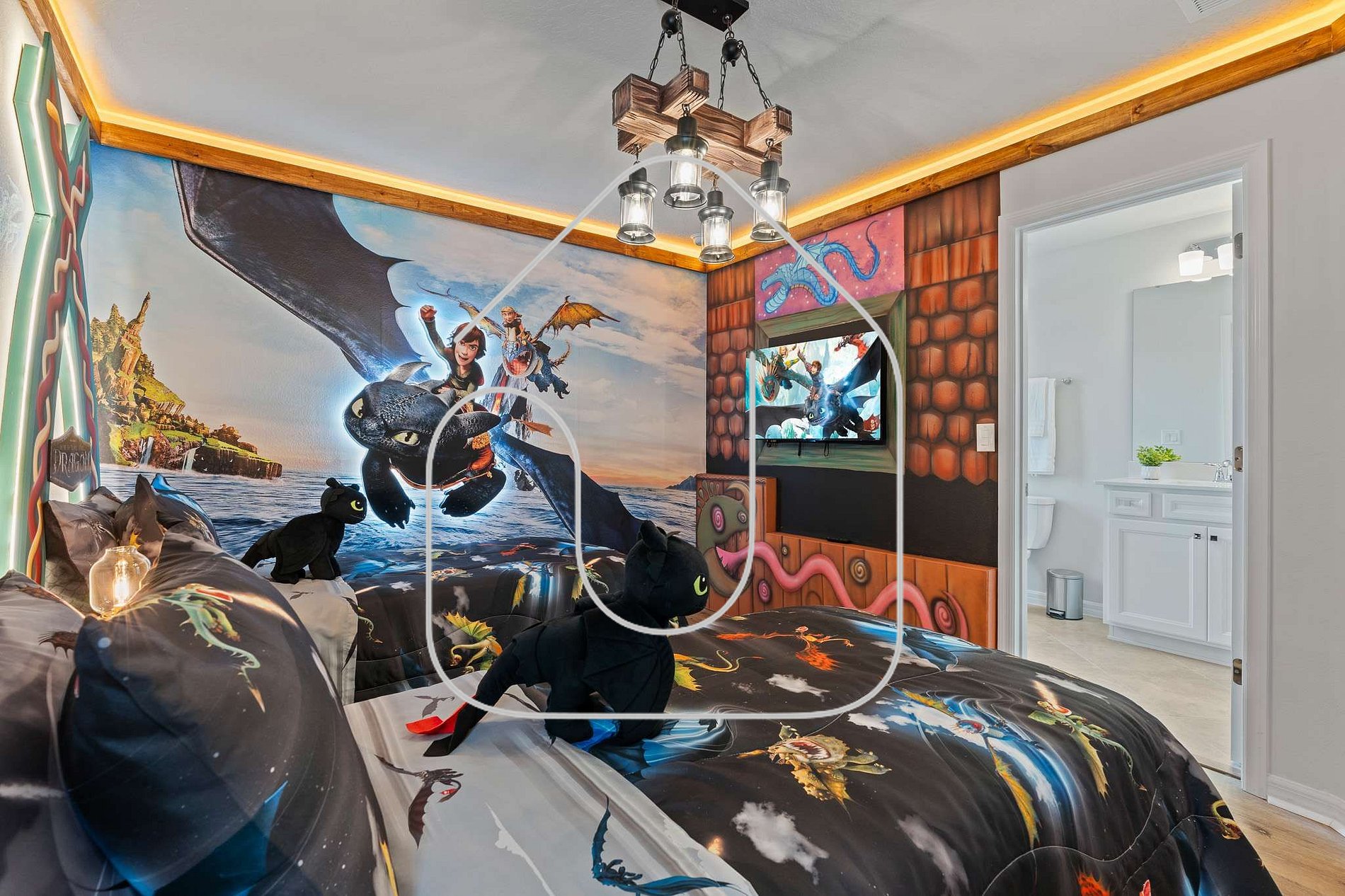 Quarto Dragões com duas camas de solteiro e trundle e banheiro privativo