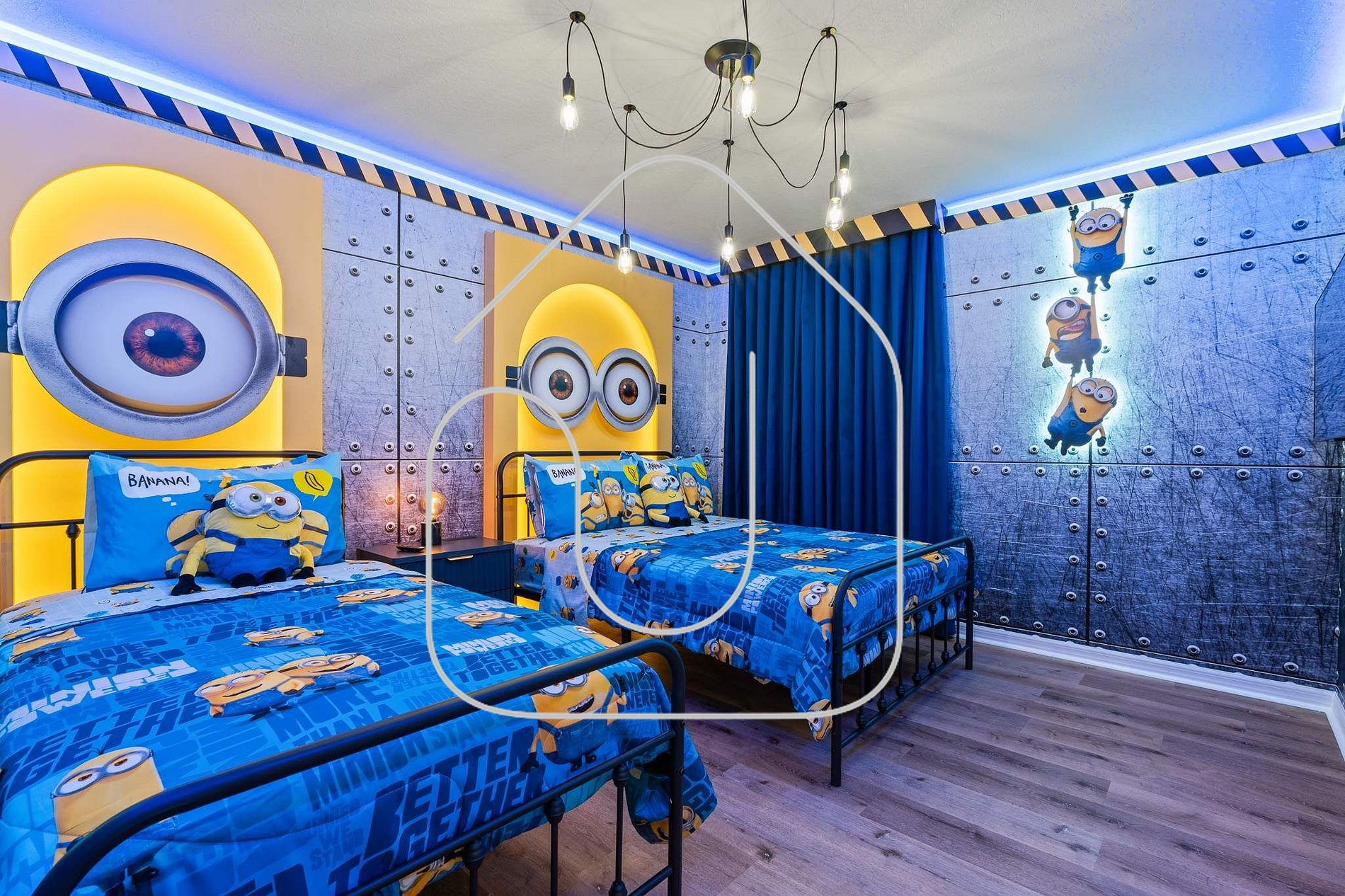 Quarto Minions com cama de casal e cama de solteiro e banheiro privativo