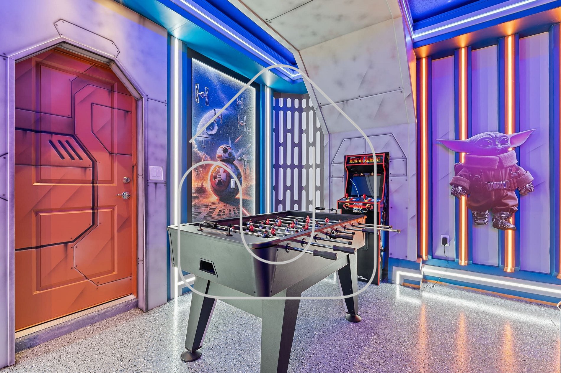 Game room Star Wars com mesa de bilhar, pebolim e jogos arcade