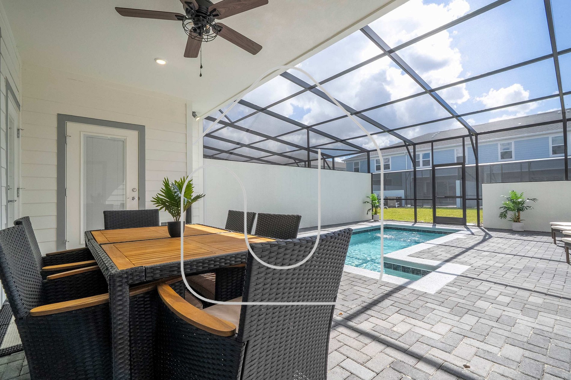 Os hóspedes têm acesso total à casa — todos os quartos, área social, piscina privativa — além das comodidades do condomínio Windsor Cay, como clube, piscina estilo resort, lazy river e splash‑pad.