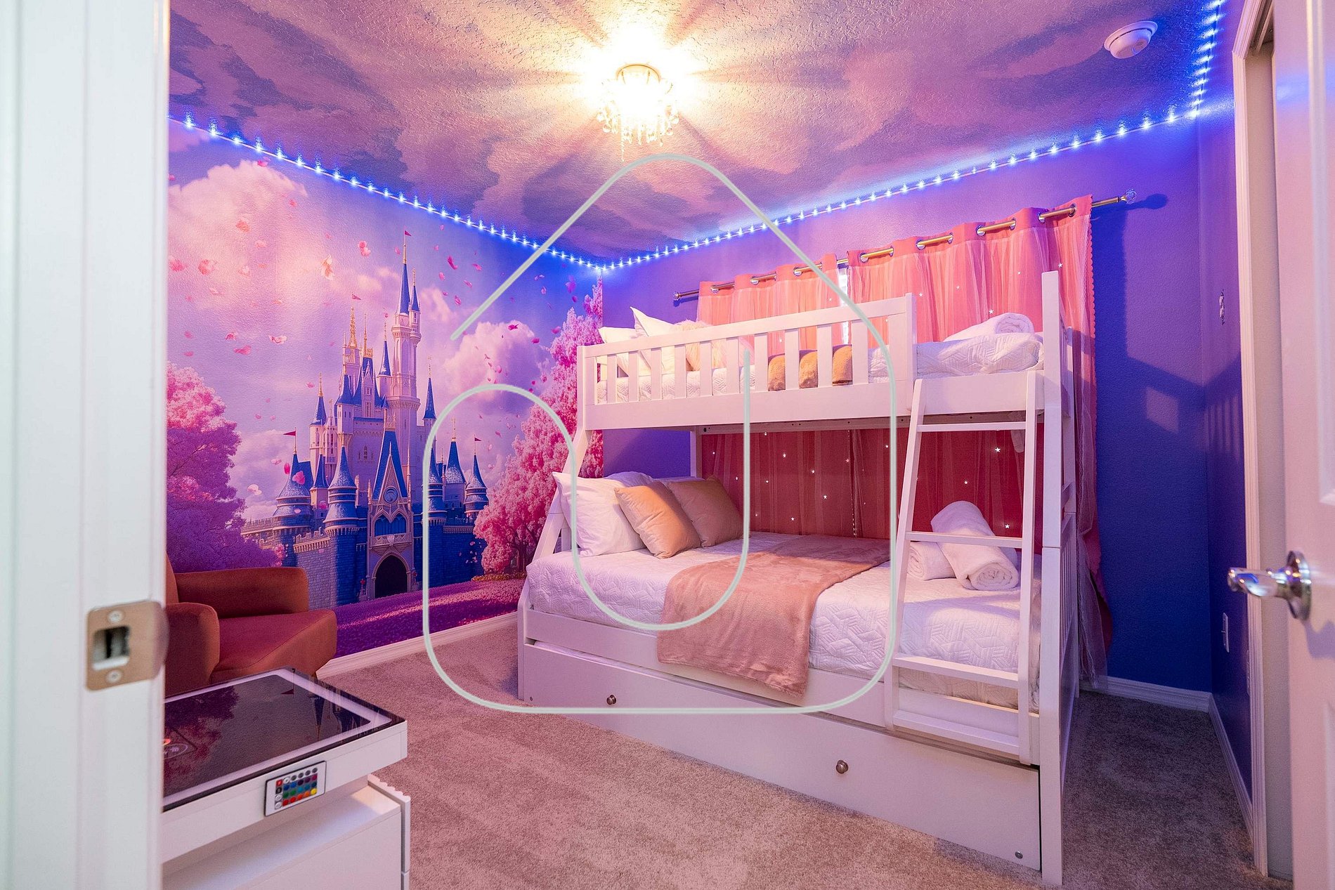 • Quarto temático Princesa com beliche (duplo + simples) e cama trundle, compartilhando banheiro