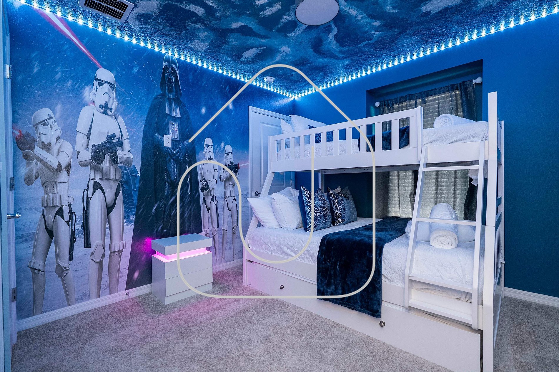• Quarto temático Star Wars com beliche (duplo + simples) e cama trundle, compartilhando banheiro