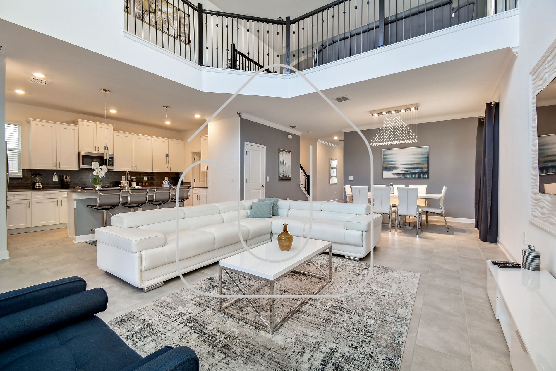 A sala de estar é aberta e espaçosa, com um sofá de 8 lugares e um sofá adicional para relaxar e desfrutar da smart TV de 65 polegadas. Esta área se abre para o lanai totalmente telado e a área da piscina.