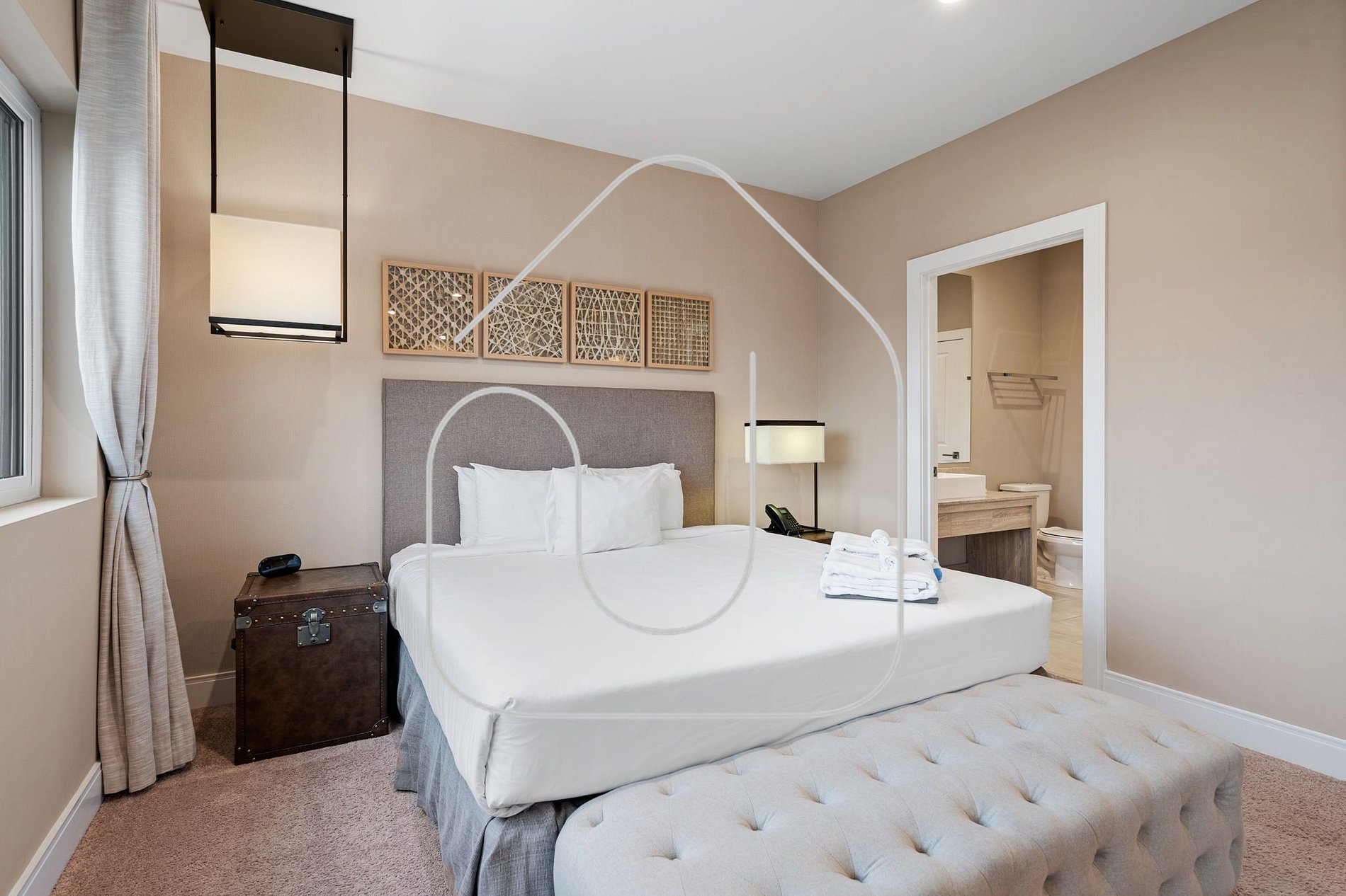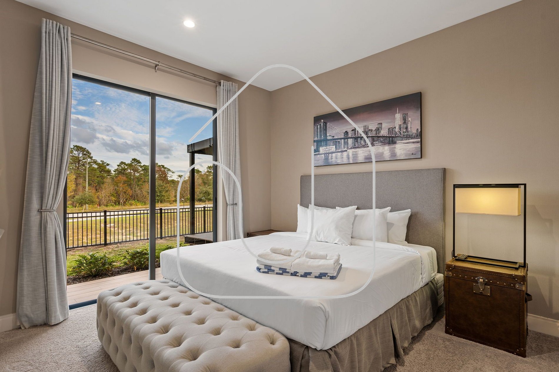 Retire-se para a luxuosa suíte principal, com cama King, banheiro privativo e decoração elegante. Este santuário é perfeito para relaxar após um dia nos parques.