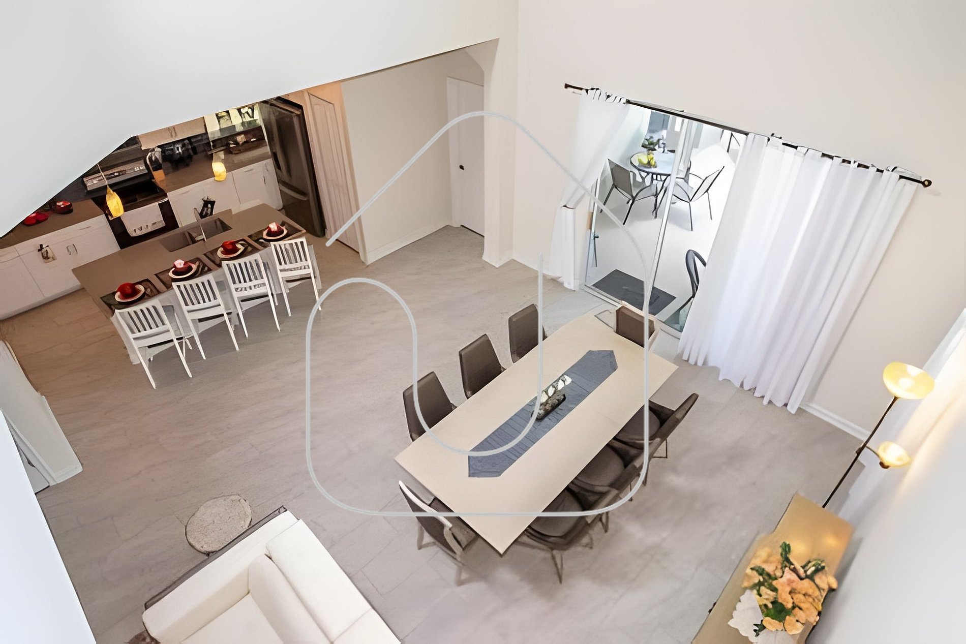 Áreas de Estar e Jantar Sala de estar com TV Smart 65”, sofá para 8 e loveseat. Sala de jantar para 8 + balcão com 4 banquetas. Cozinha moderna totalmente equipada.