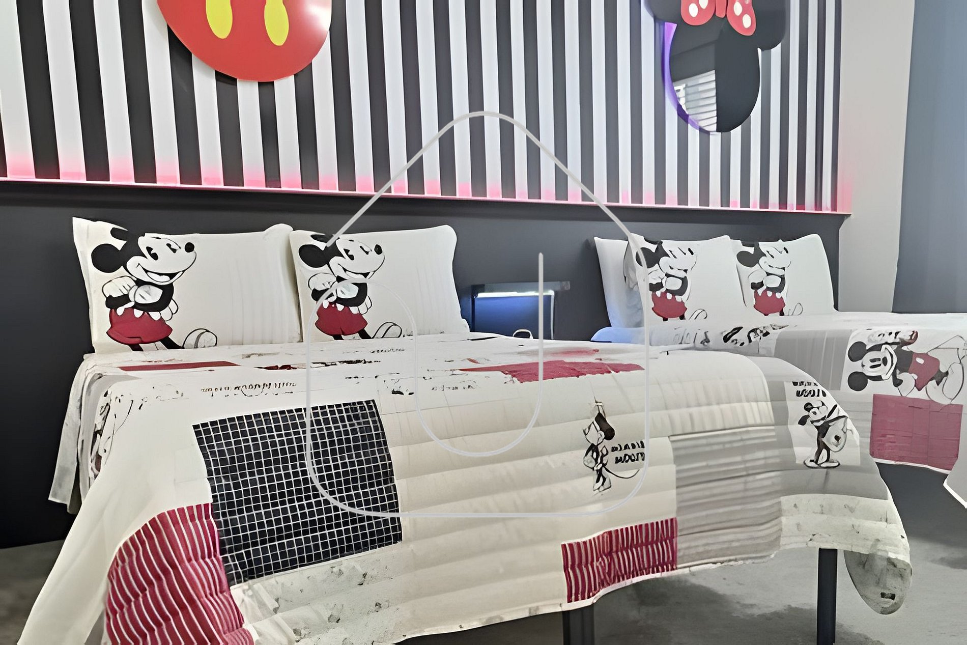 Quarto Mickey & Minnie: 2 camas full, Smart TV, banheiro compartilhado. Quarto Mario Bros: beliche solteiro, Smart TV, banheiro compartilhado.