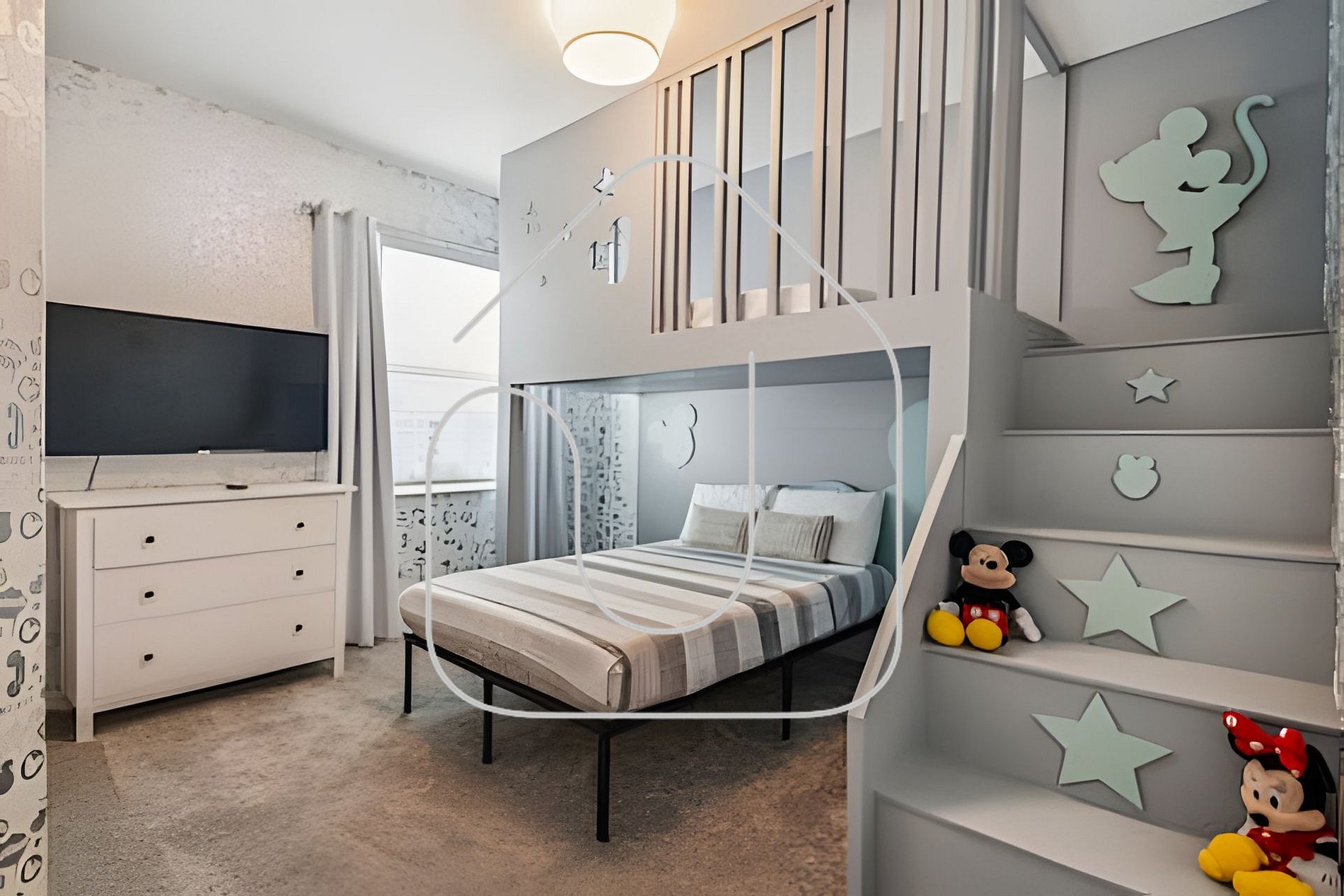 Quarto Temático Mickey: Beliche (Full + Twin), Smart TV, banheiro compartilhado.