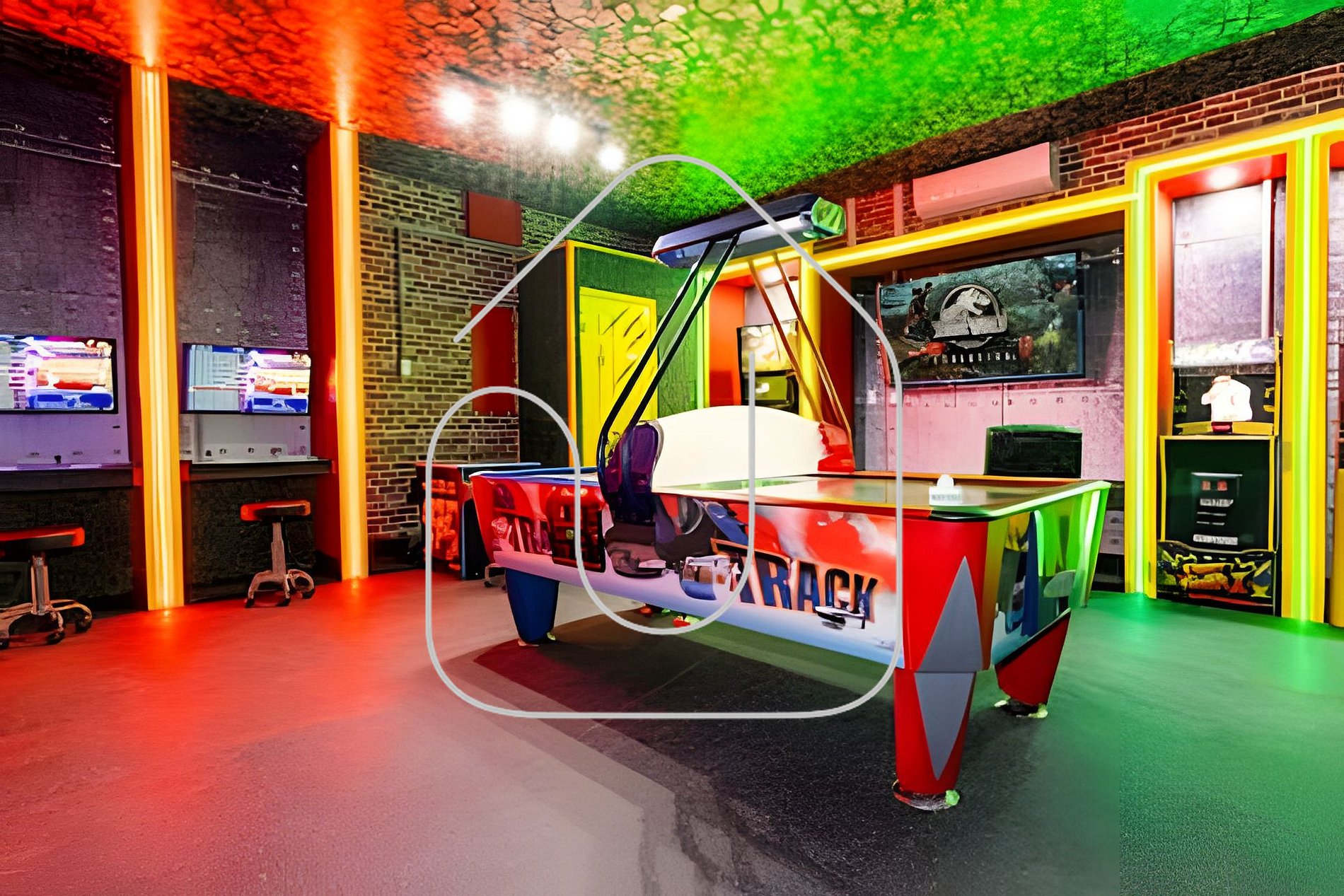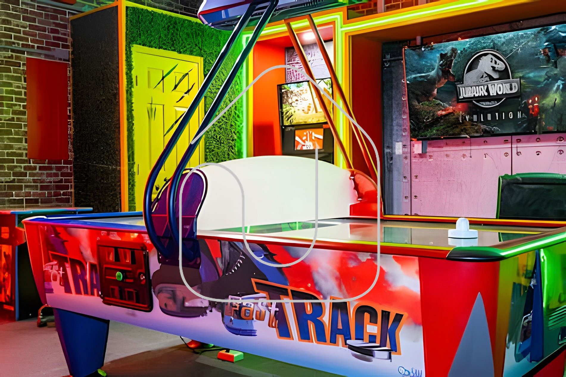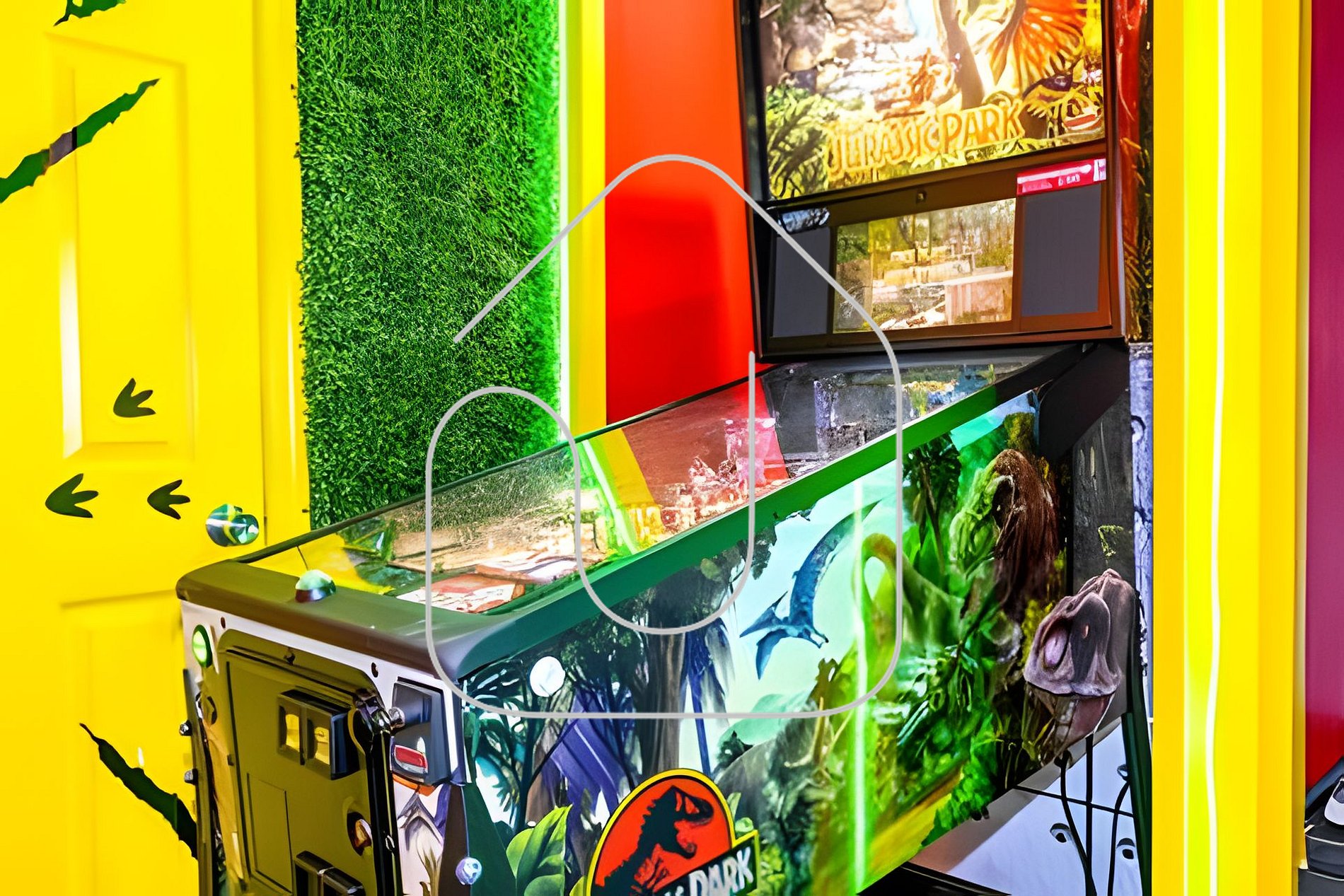 A sala de jogos climatizada com tema Jurassic Park é um verdadeiro paraíso para todas as idades. Divirta-se com jogos de arcade como Street Fighter, Pacman e Jurassic Park Pinball. Desafie a família em uma partida de pebolim ou air hockey, ou relaxe nas cadeiras gamer enquanto assiste à Smart TV de 65". Esse ambiente promete ser um dos favoritos dos hóspedes.