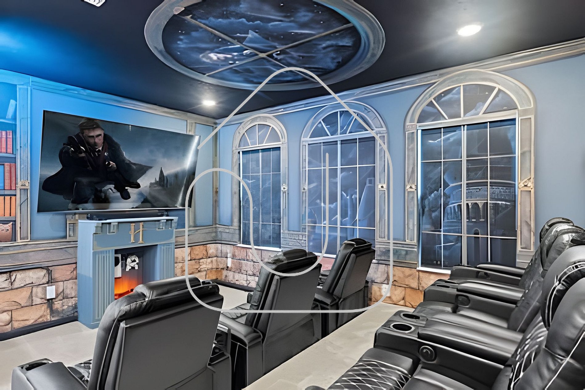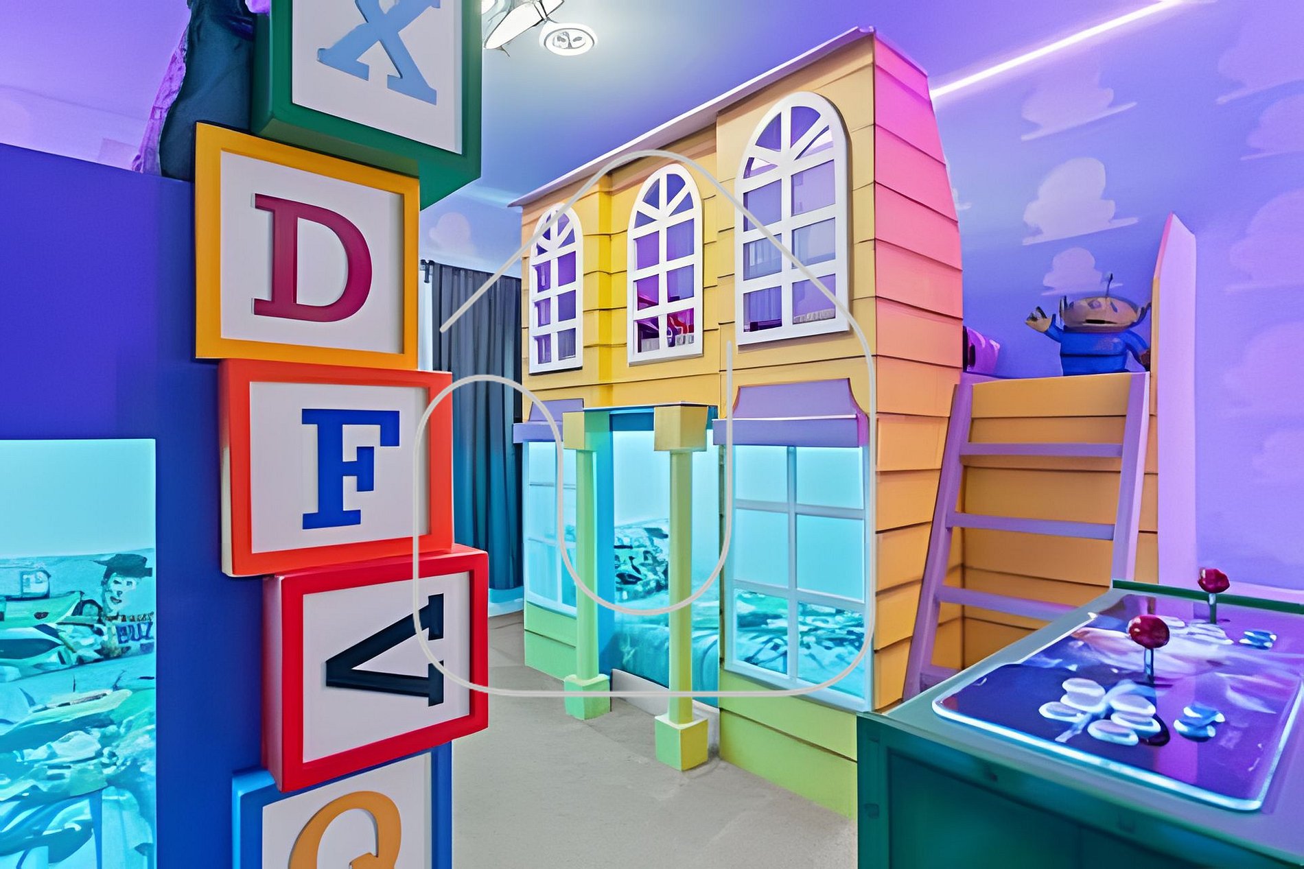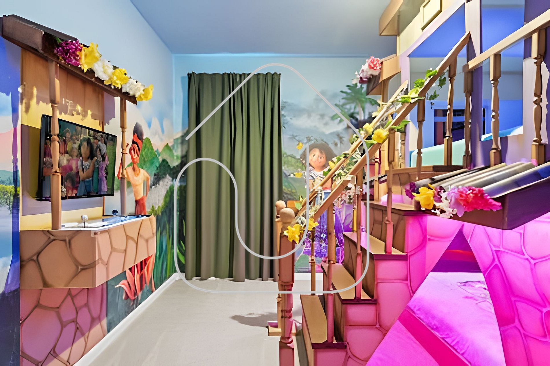 O interior conta com amplas áreas integradas de estar e jantar, cozinha completa com eletros modernos e quartos temáticos inspirados em Minions, Toy Story, Super Mario e Encanto, além de um incrível cinema Harry Potter com TV de 85” e poltronas reclináveis.