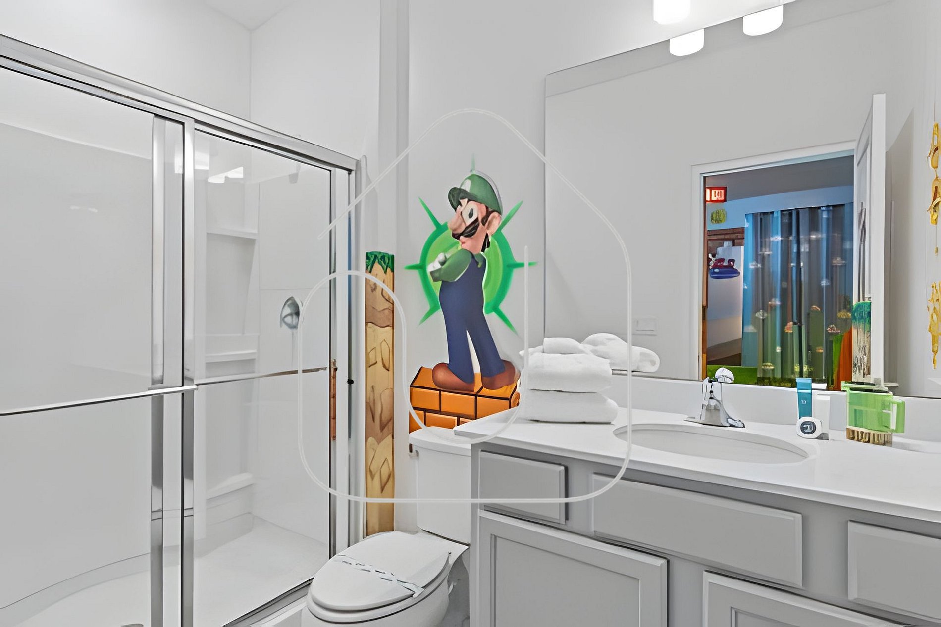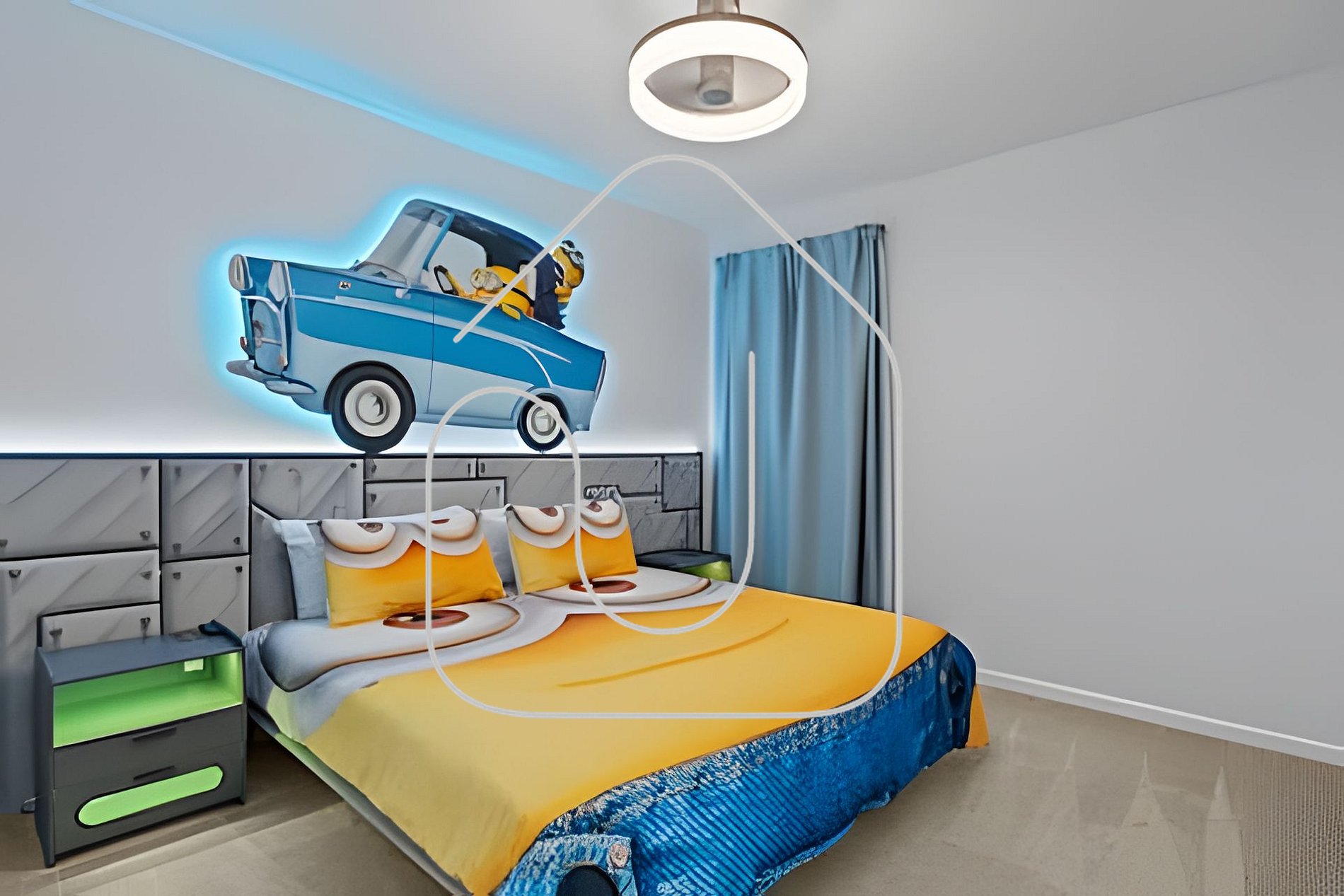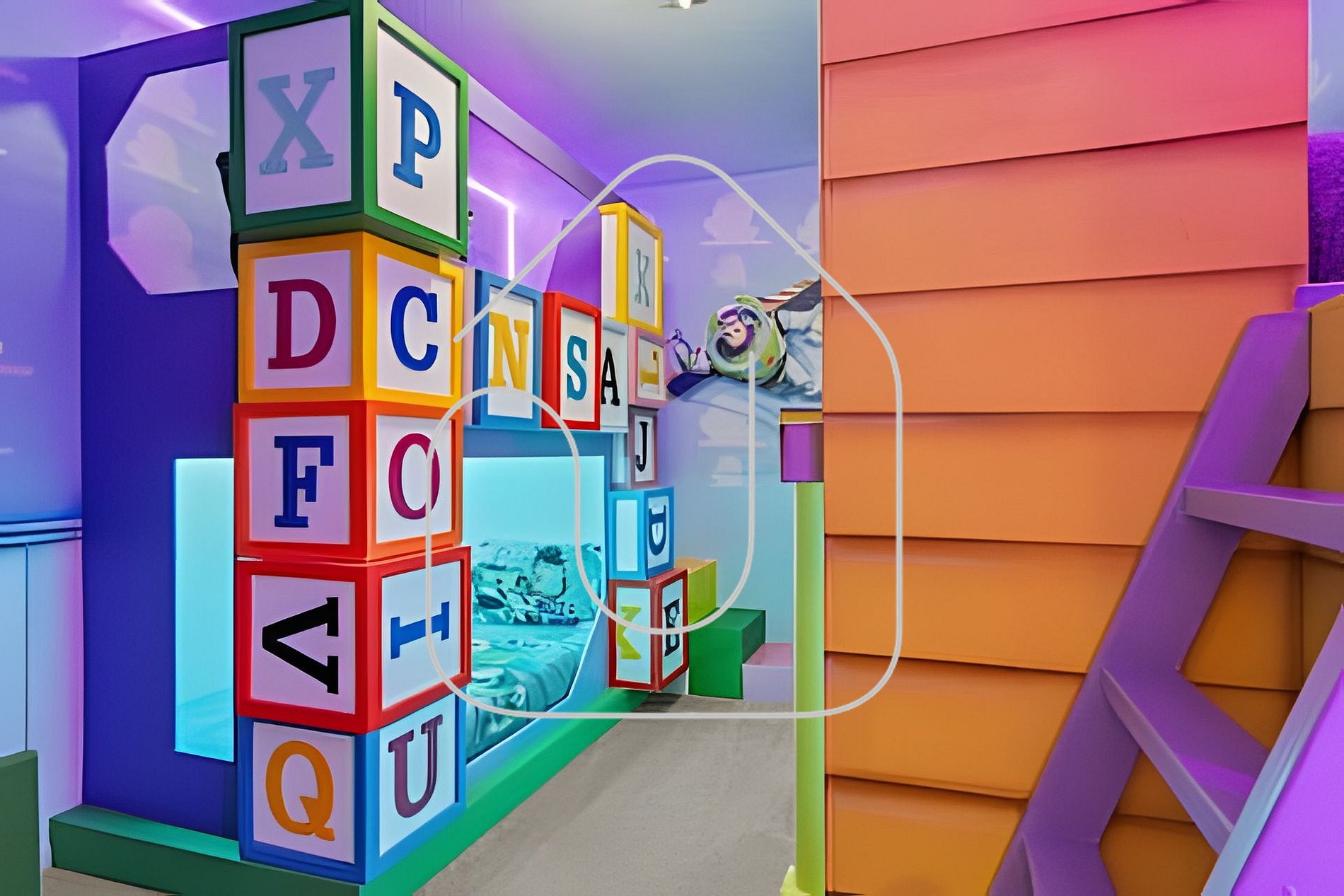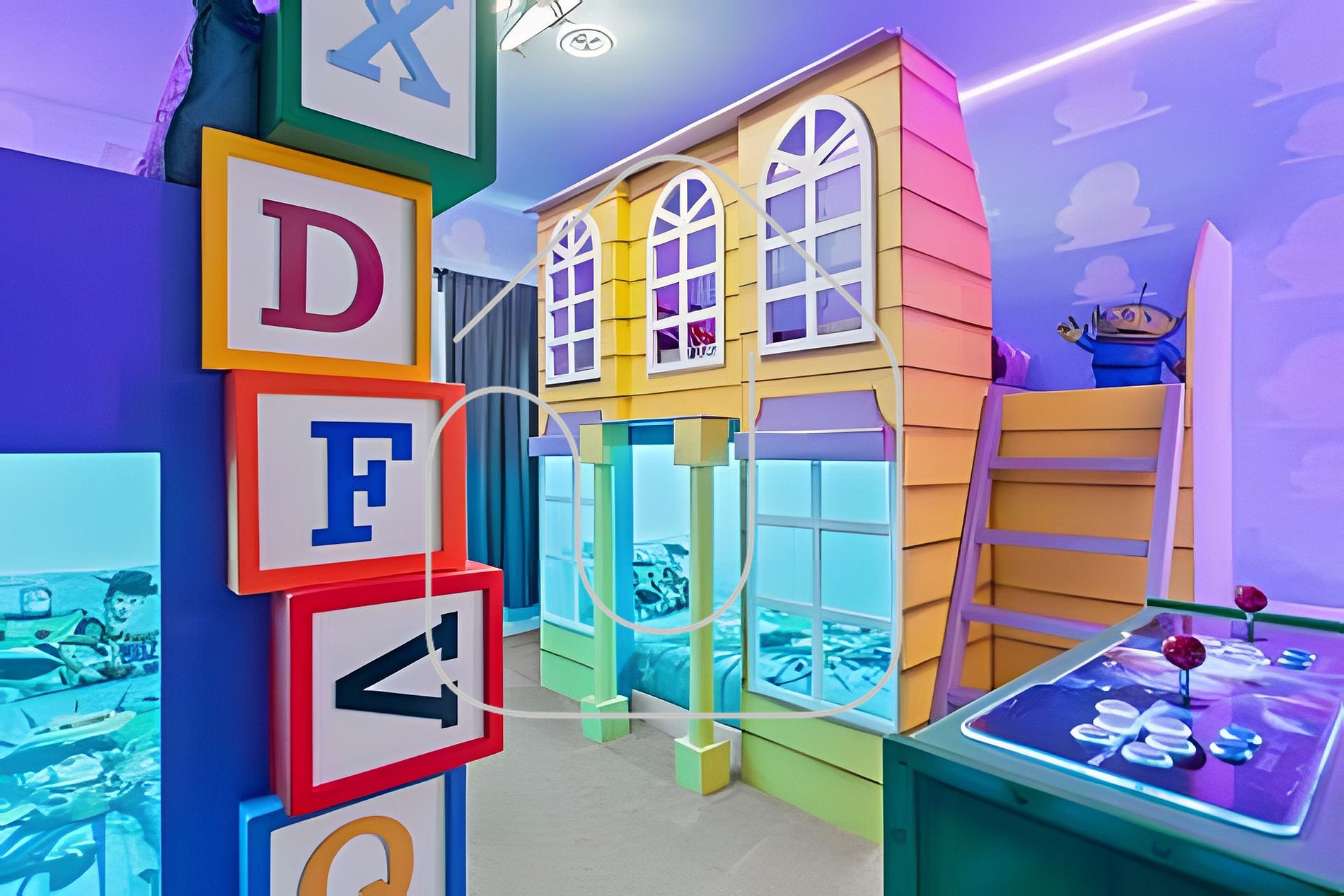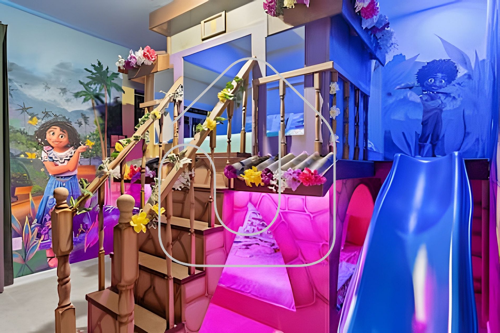 Os quartos temáticos encantam adultos e crianças, com decorações inspiradas em Mickey, Minions, Toy Story, Mario e Encanto. O loft no andar superior é um cinema temático do Harry Potter com poltronas reclináveis e TV Smart de 85".