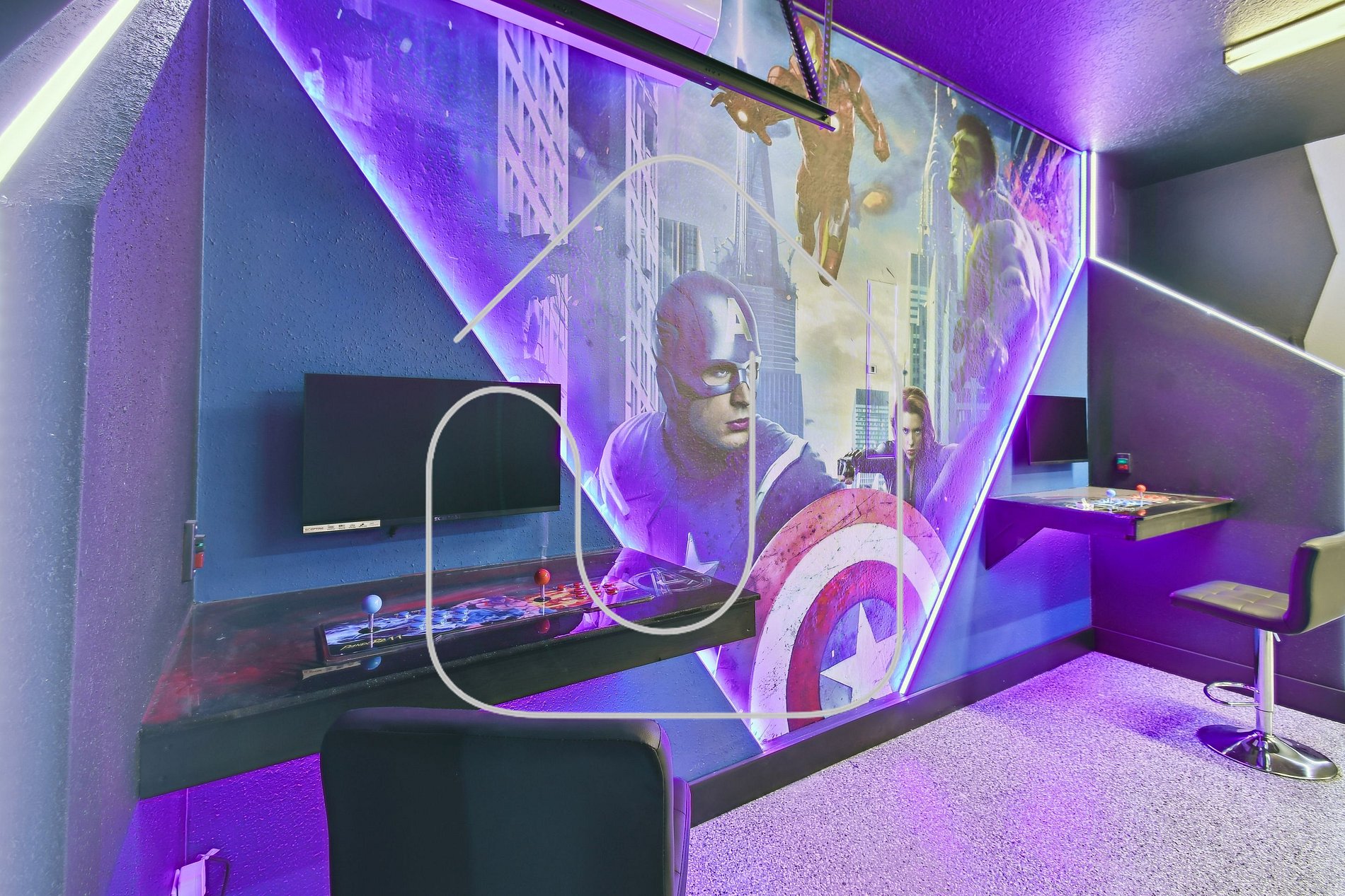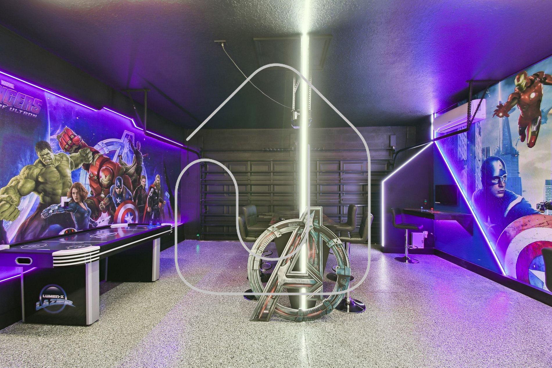 Sua família vai adorar a divertida sala de jogos temática dos Vingadores, equipada com: