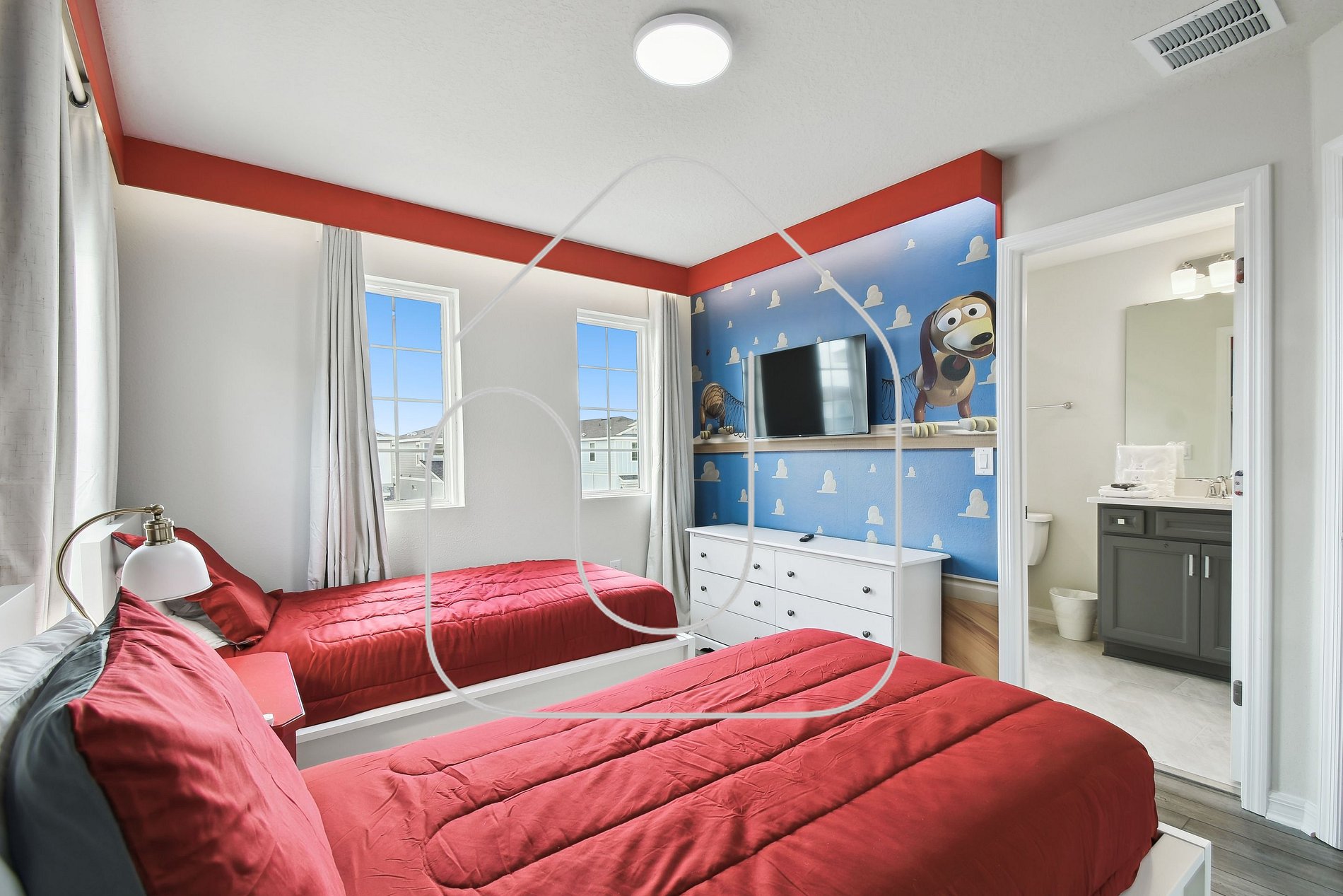 Suíte Toy Story: 2 camas de solteiro, SMART TV, closet e banheiro privativo.
