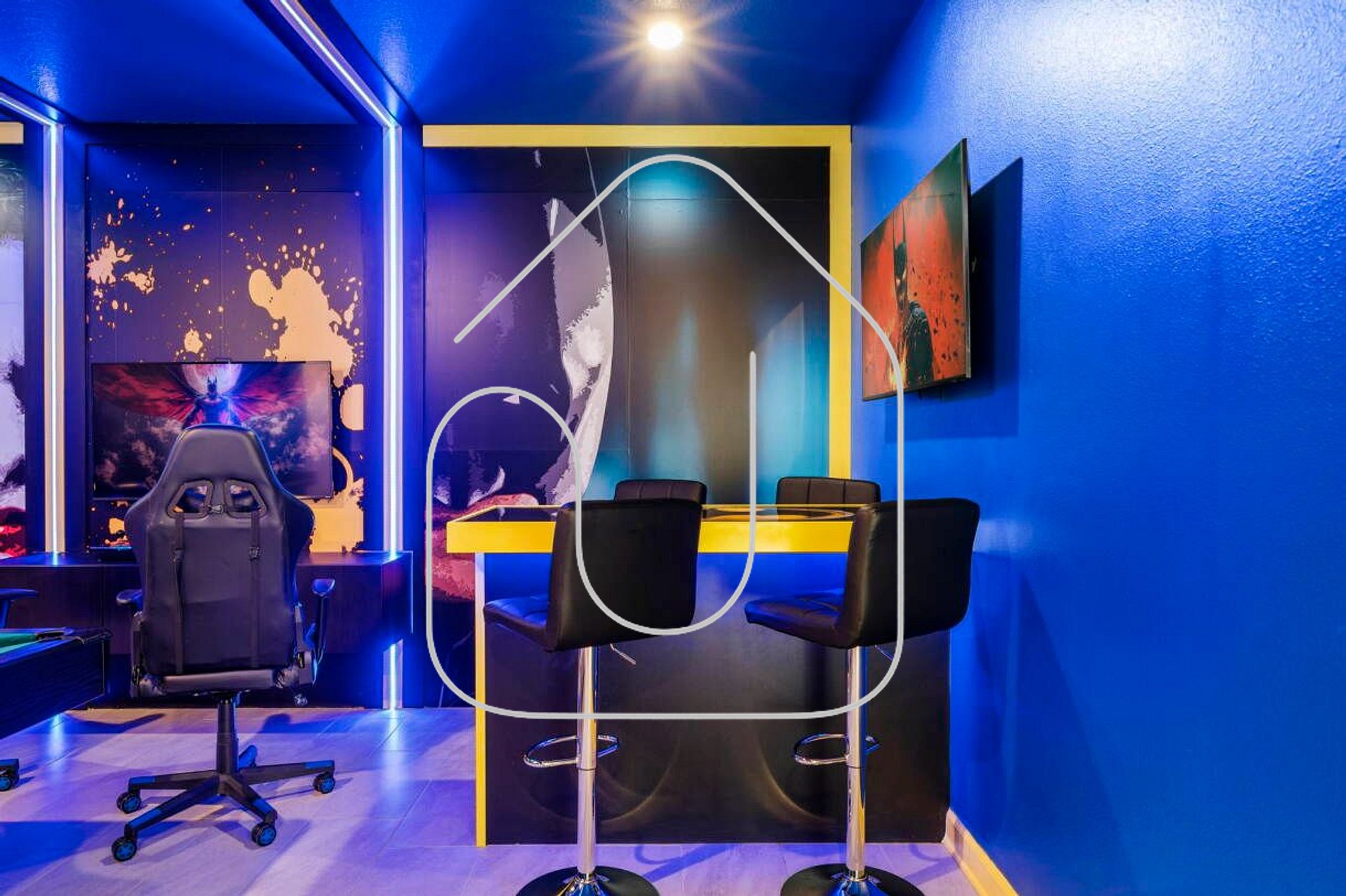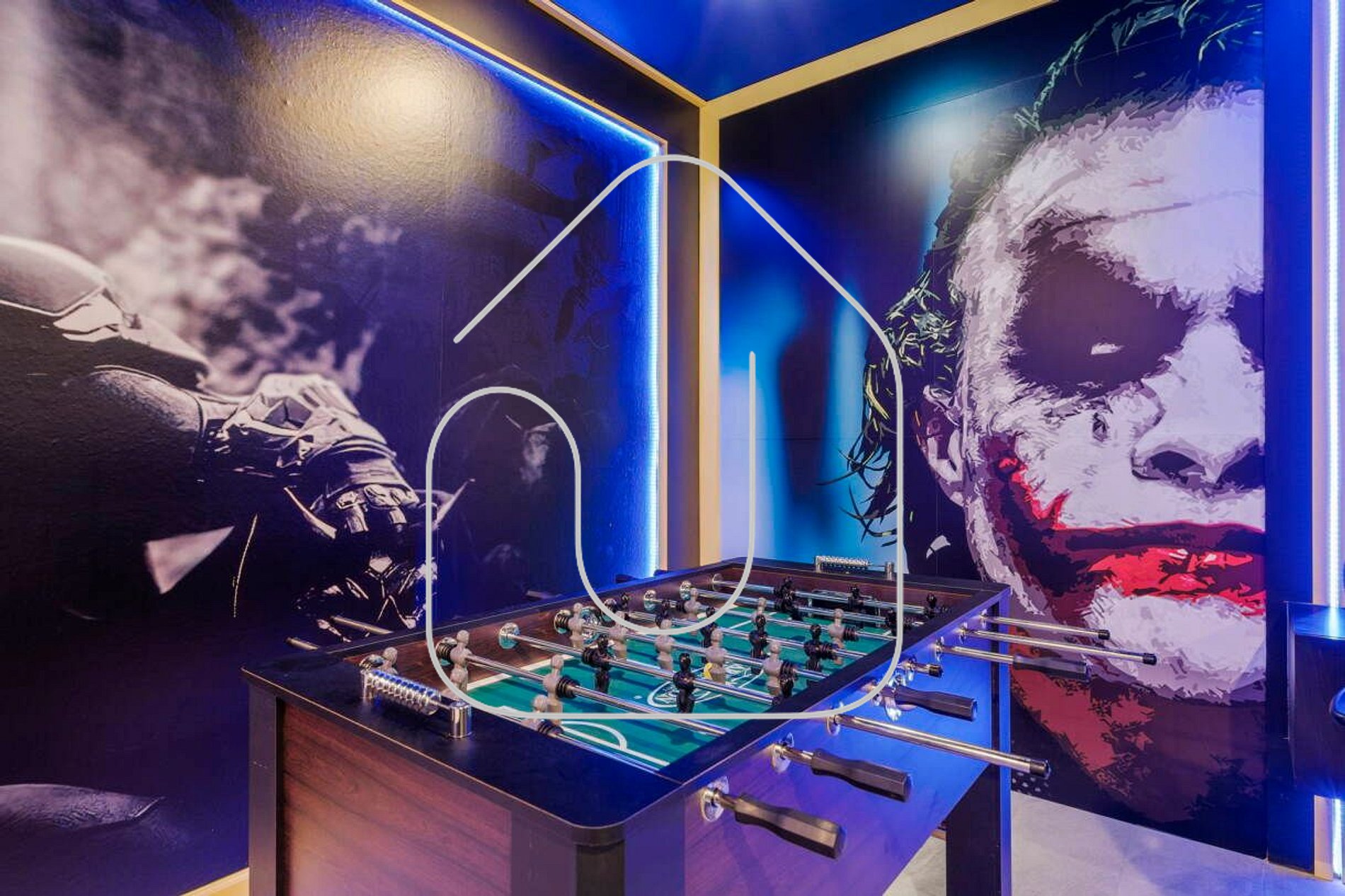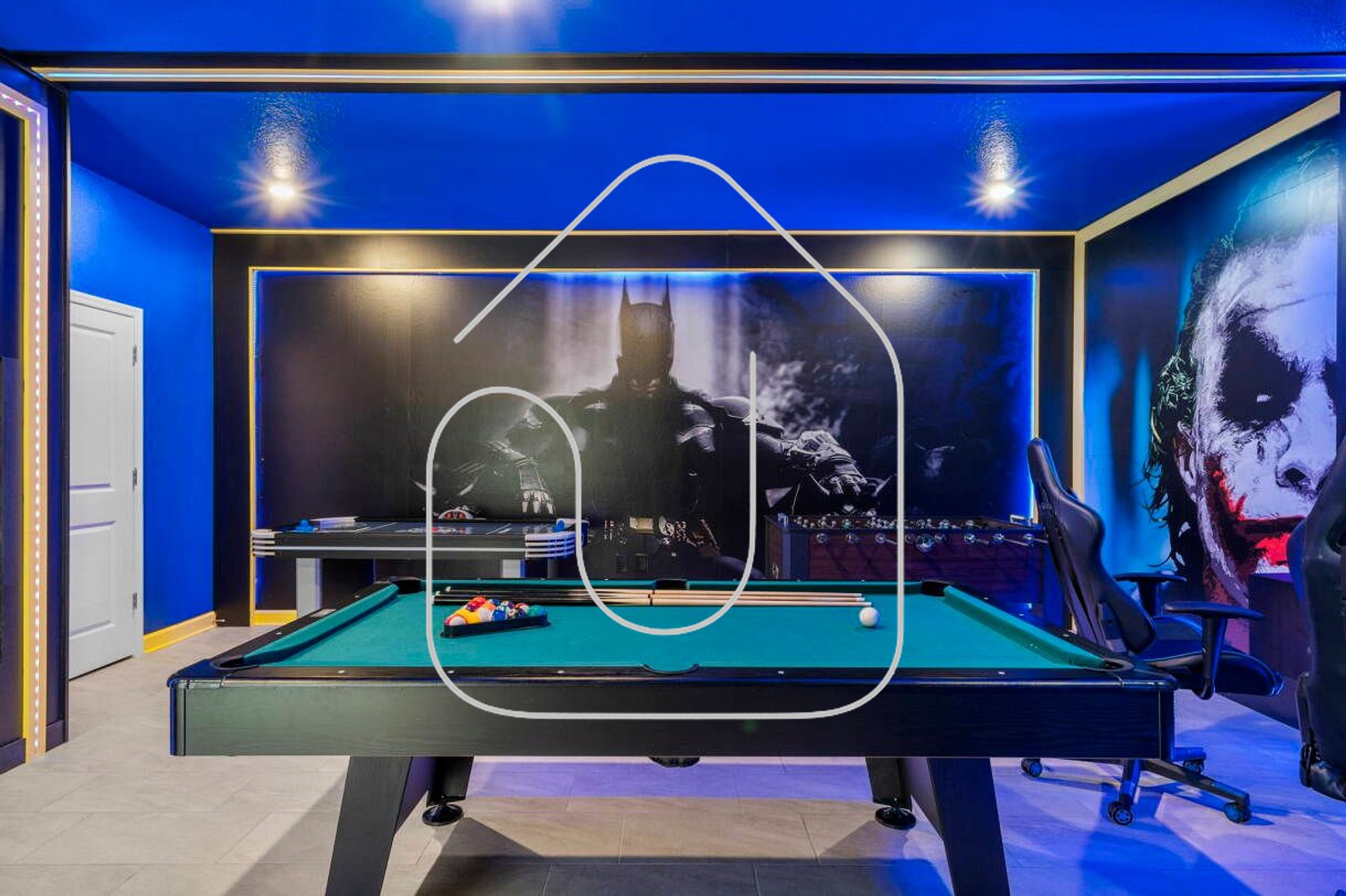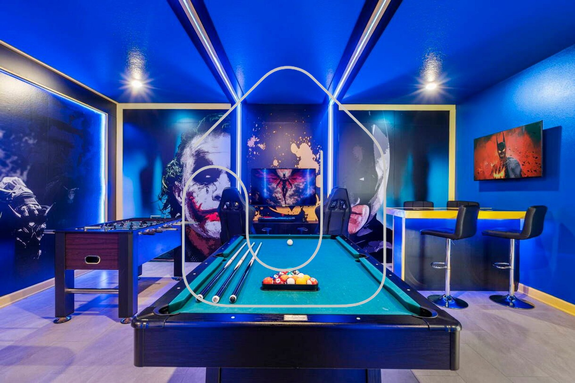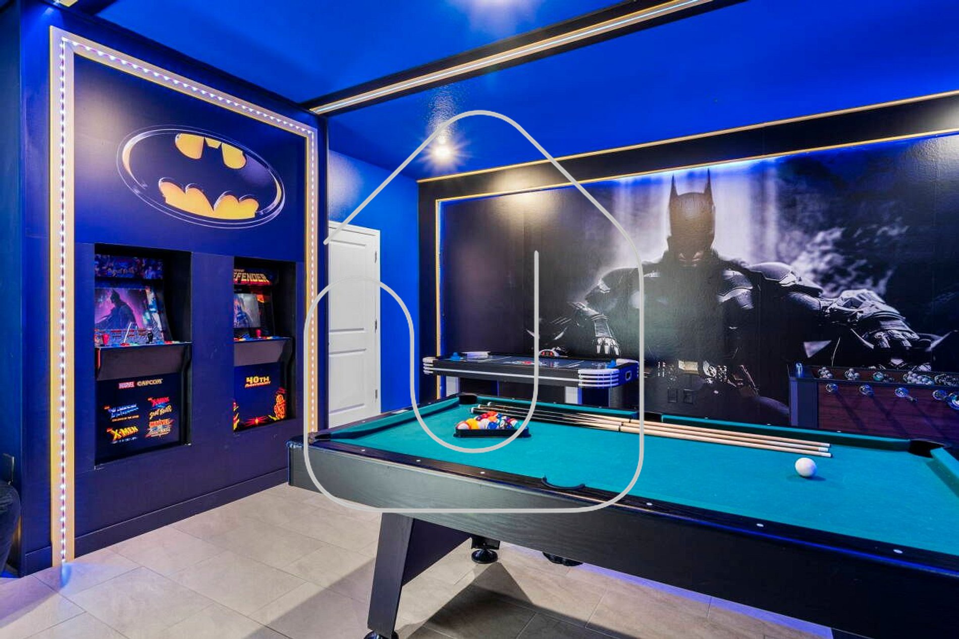 Sala de Jogos (tema Batman) com 2 arcades, playstation, mesa de sinuca, air rock, toto, mesa de bar com TV de 50' e sofá