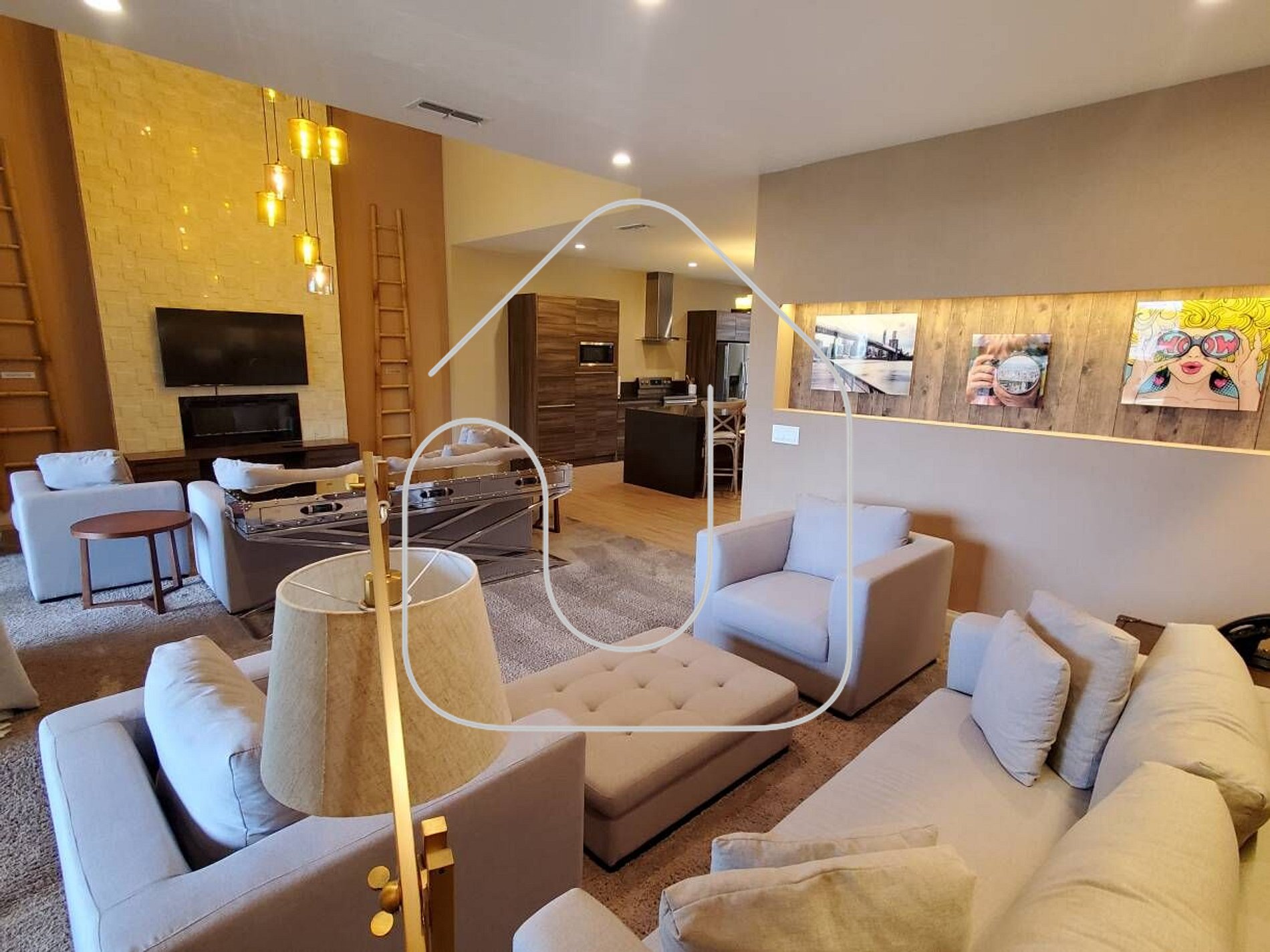 -Sala de Estar: Tetos altos, belos sofás, chaises longues, lareira elétrica e TV de 55 polegadas, criando um ambiente espaçoso e luxuoso.