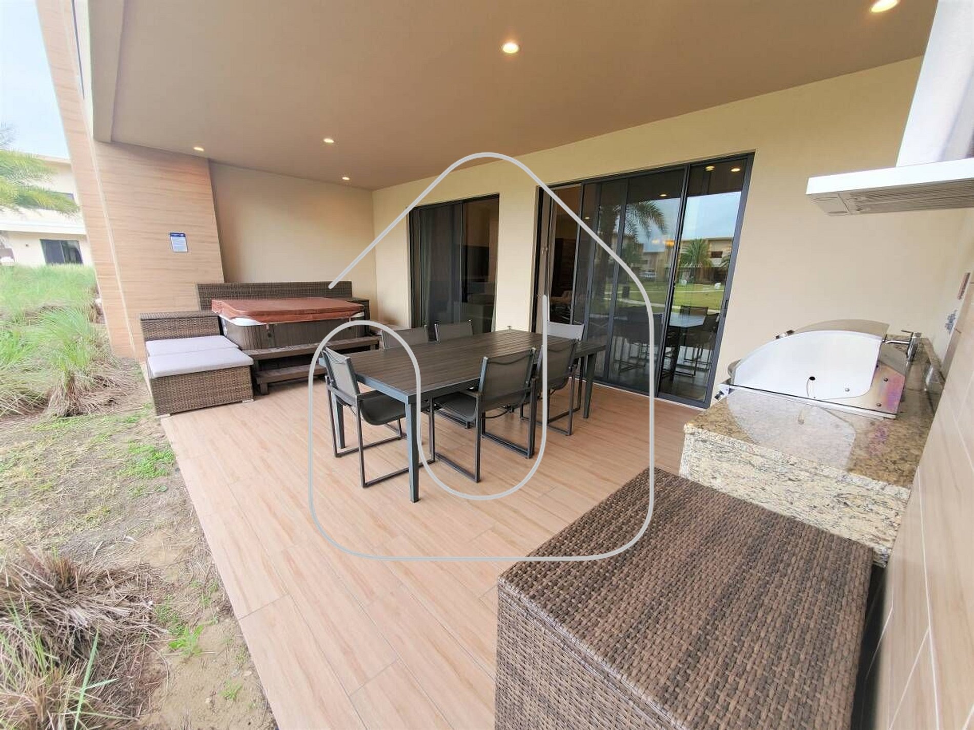 -Varanda: Grande terraço com churrasqueira, mesa com 6 cadeiras e jacuzzi.